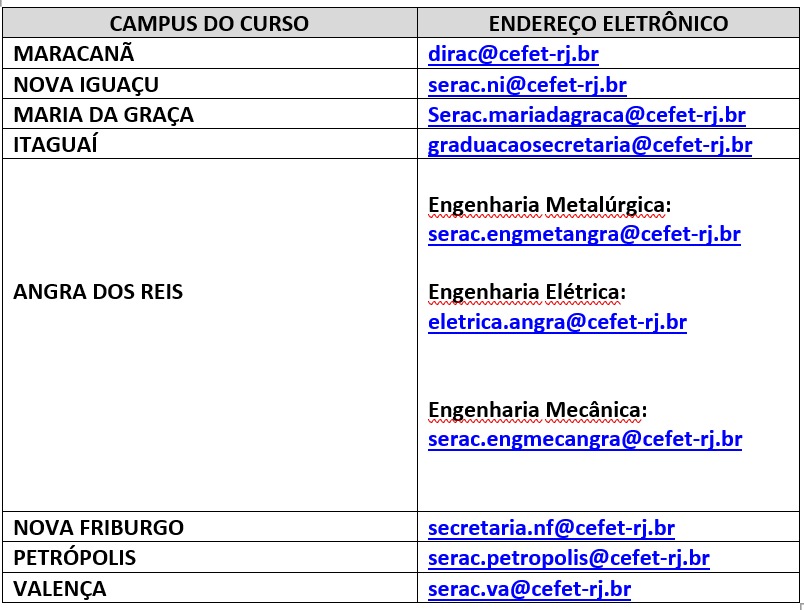 1º SEMESTRE: Angra dos Reis, Itaguaí, Maracanã, Maria da Graça, Nova Friburgo, Nova Iguaçu, Petrópolis, Valença
