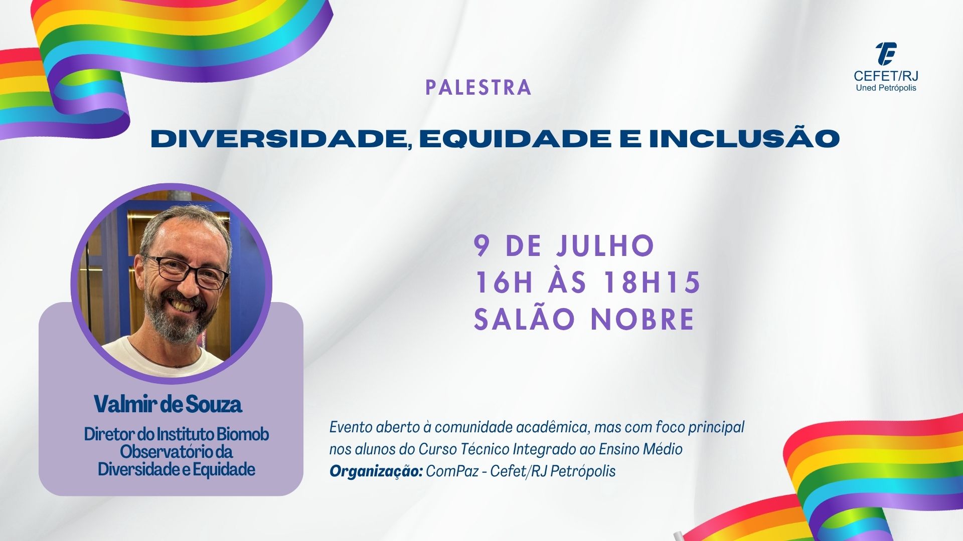 Dando continuidade à campanha de conscientização e enfrentamento à LGBTQIAPN+fobia, a Comissão para a Promoção de uma Cultura de Paz (ComPaz) do Cefet/RJ Petrópolis realiza no próximo dia 9 de julho mais uma atividade formativa: a palestra “Diversidade, Equidade e Inclusão”. O evento – que é aberto à comunidade acadêmica, mas voltado sobretudo aos alunos do ensino médio integrado – acontecerá no Salão Nobre das 16h às 18h15 e será ministrado por Valmir de Souza, CEO da empresa Biomob Soluções Digitais.