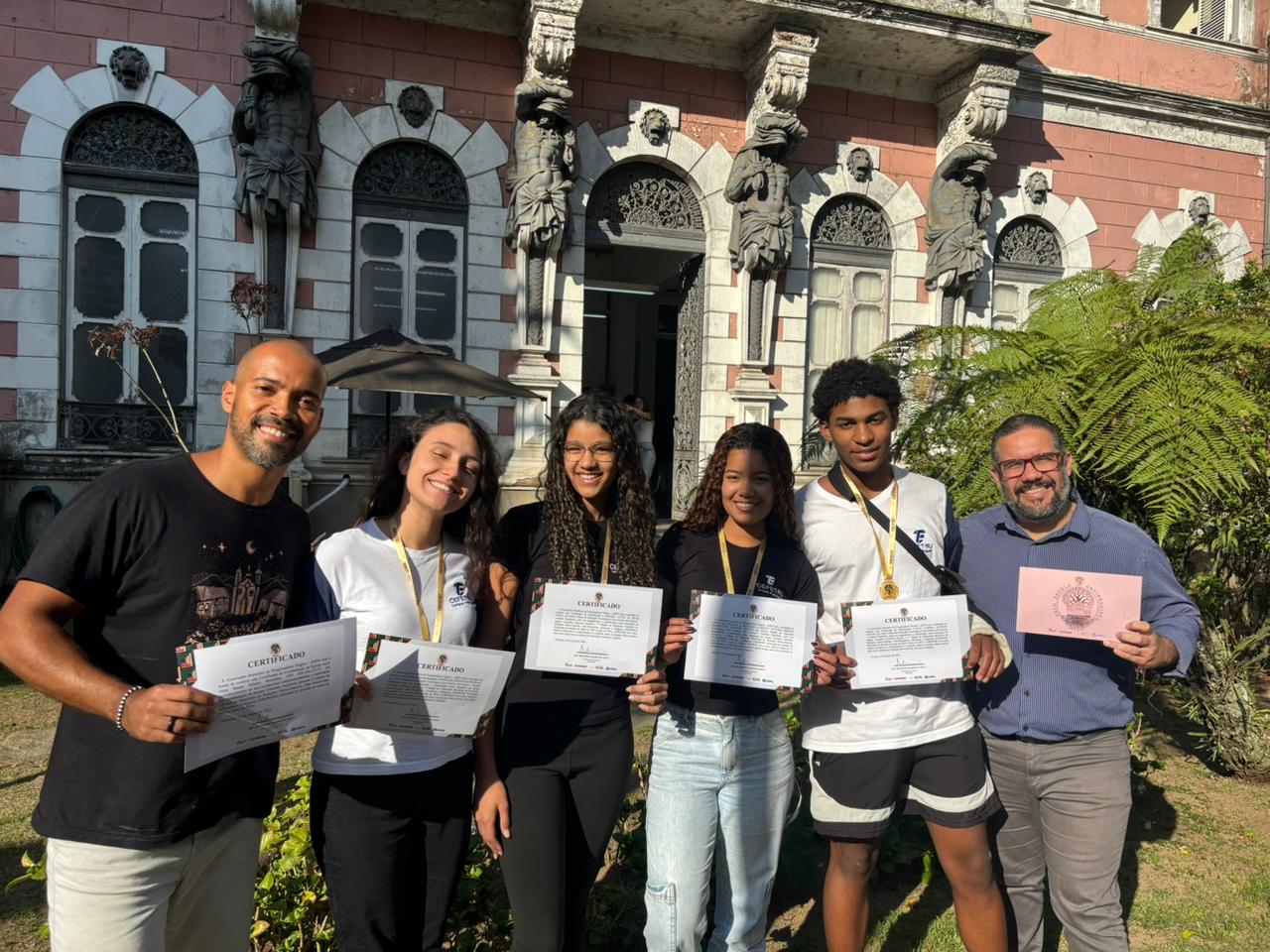 Renan Ribeiro e o diretor do Cefet/RJ Petrópolis, Felipe Henriques, com os alunos Nathalie, Heloísa, Iasmym e João Gabriel, que receberam medalhas e certificados de participação