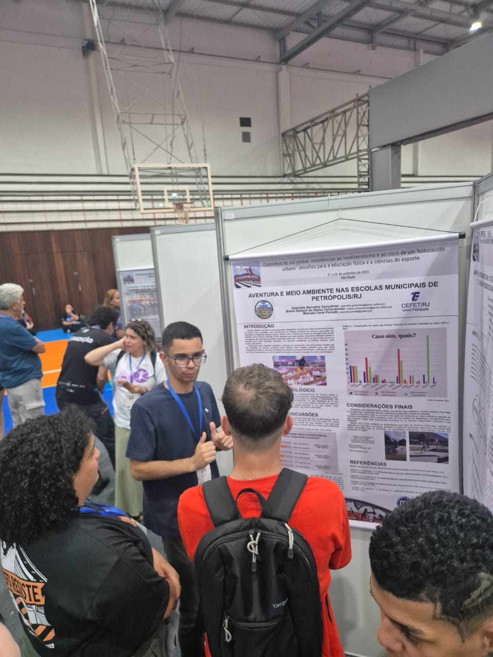 Já Breno Badaró, do 3º ano, apresentou o artigo “Aventura e meio ambiente nas escolas municipais de Petrópolis/RJ”, desenvolvido com a estudante Gabriella Barcelos (também do 3º ano). A pesquisa abordou como vêm sendo trabalhadas as práticas corporais de aventura e a Educação Física nas escolas municipais de Petrópolis. Além de Jabez e Breno, a aluna Iasmym Maciel, do 3º ano, participou do evento, representando o projeto de extensão “Conhecendo os limites do corpo e o Cefet/RJ Petrópolis”, no qual atua como bolsista.