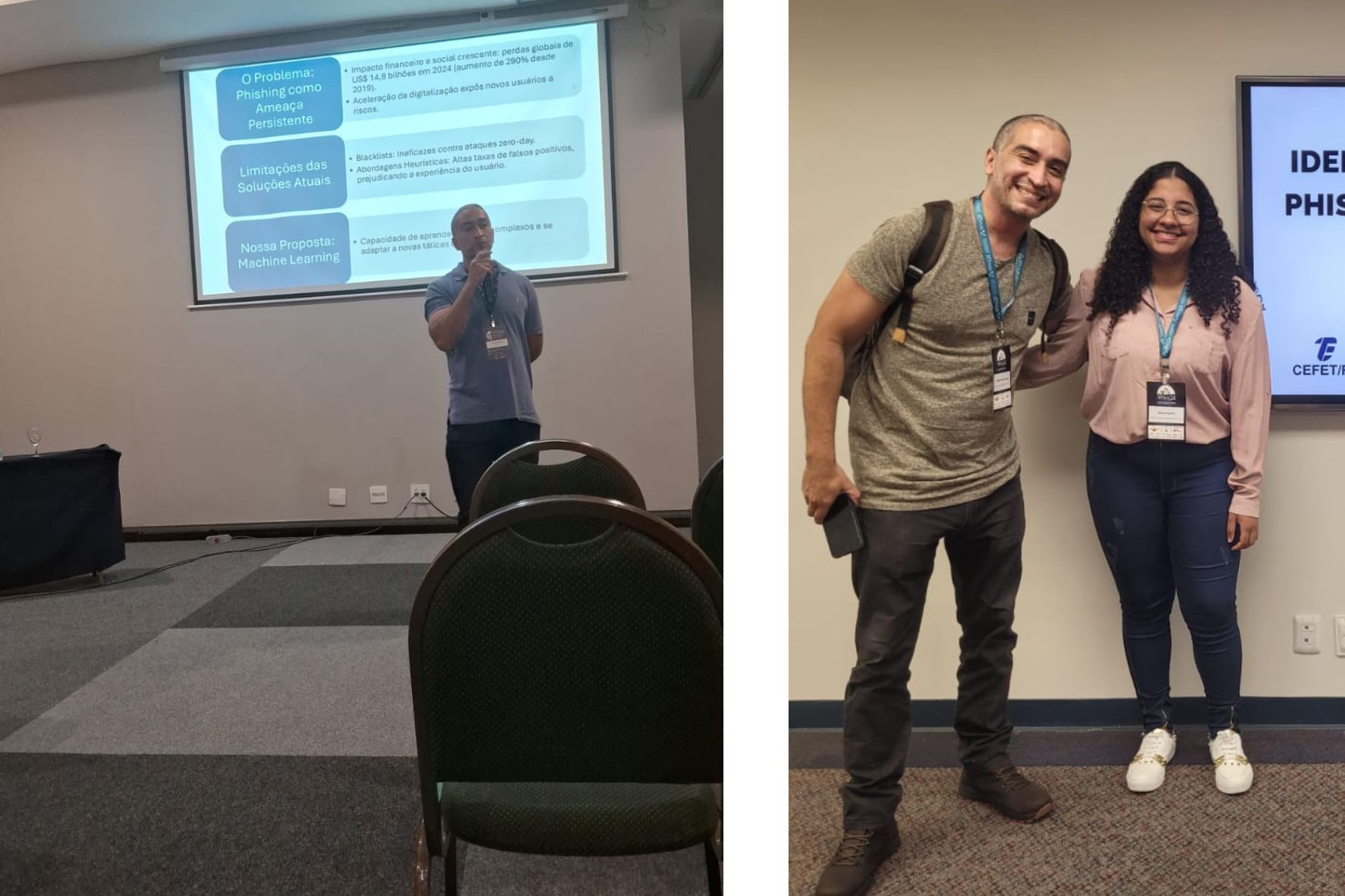 (À esq.) O professor Dalbert Mascarenhas apresenta o trabalho "Phishing Guardian", já que Bianca Guarizi não pode estar presente no evento // (À dir.) Bianca e Dalbert na edição 2024 do SBSeg.
