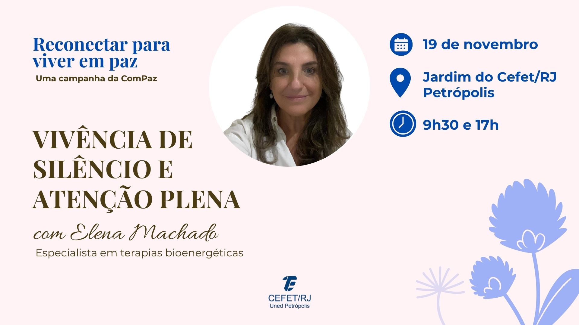 A Comissão Permanente para Promoção de uma Cultura de Paz (ComPaz) do Cefet/RJ Petrópolis realiza no dia 19 de novembro (quarta-feira) a atividade “Vivência de Silêncio e Atenção Plena”. Voltada para a comunidade acadêmica, o evento acontecerá no jardim da unidade em dois horários: às 9h30 e às 17h.