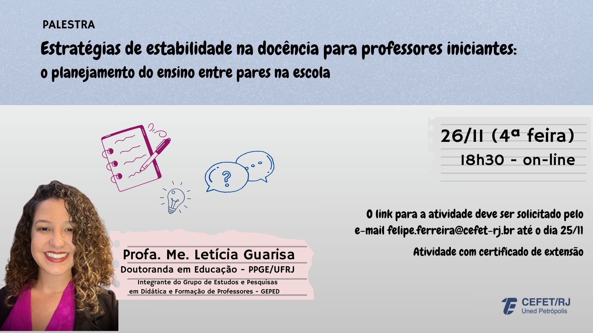 No dia 26 de novembro (quarta-feira), às 18h30, o Cefet/RJ Petrópolis promove a palestra on-line “Estratégias de estabilidade na docência para professores iniciantes: o planejamento do ensino entre pares na escola”.  O evento, que será ministrado pela professora e mestre em Educação Letícia Guarisa, é gratuito e aberto a todo público.