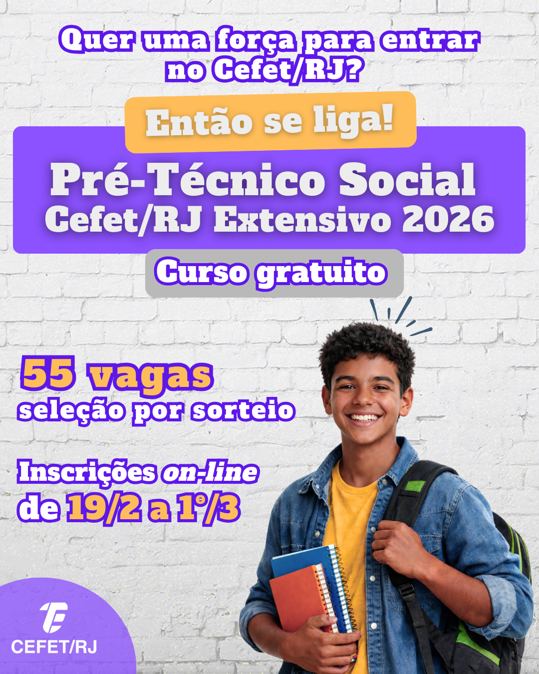 A Diretoria de Extensão (DIREX), por meio do Departamento de Extensão e Assuntos comunitários (DEAC), divulga o edital do Projeto Pré-Técnico Social Extensivo 2026. O objetivo é preparar, gratuitamente, estudantes da rede pública para concorrer às vagas dos cursos técnicos integrados ao ensino médio da instituição em 2027. O edital oferta 55 vagas para o turno da tarde, com aulas de segunda a sexta-feira, das 15h às 18h20, no Campus 3 da Unidade Maracanã. As inscrições podem ser realizadas entre os dias 19 de fevereiro e 1º de março. Clique aqui para acessar o link.