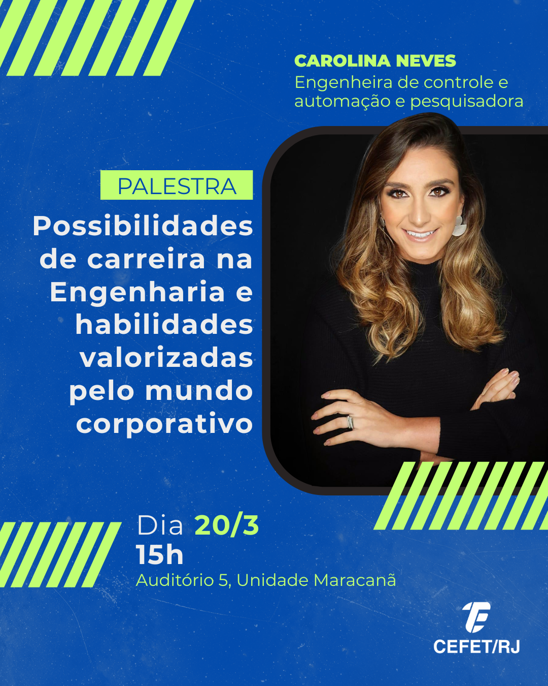 Na próxima sexta-feira, 20 de março, a Unidade Maracanã vai receber a engenheira de controle e automação e pesquisadora Carolina Neves para falar sobre “Possibilidades de carreira na Engenharia e habilidades valorizadas pelo mundo corporativo”. O evento acontecerá às 15h, no Auditório 5 e é organizado pela Coordenação de Engenharia Elética. Não é necessário realizar inscrição prévia.