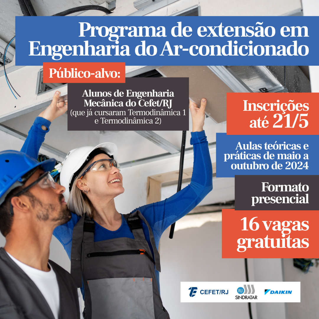 O Cefet/RJ está com inscrições abertas, até o dia 21/5, para a primeira turma do Programa de Extensão em Engenharia do Ar-Condicionado, um treinamento na área de refrigeração e climatização elaborado em parceria com o Sindicato da Industria de Refrigeração, Aquecimento e Tratamento de Ar do Estado do Rio de Janeiro (SINDRATAR-RJ) e apoio da empresa Daikin Brasil.