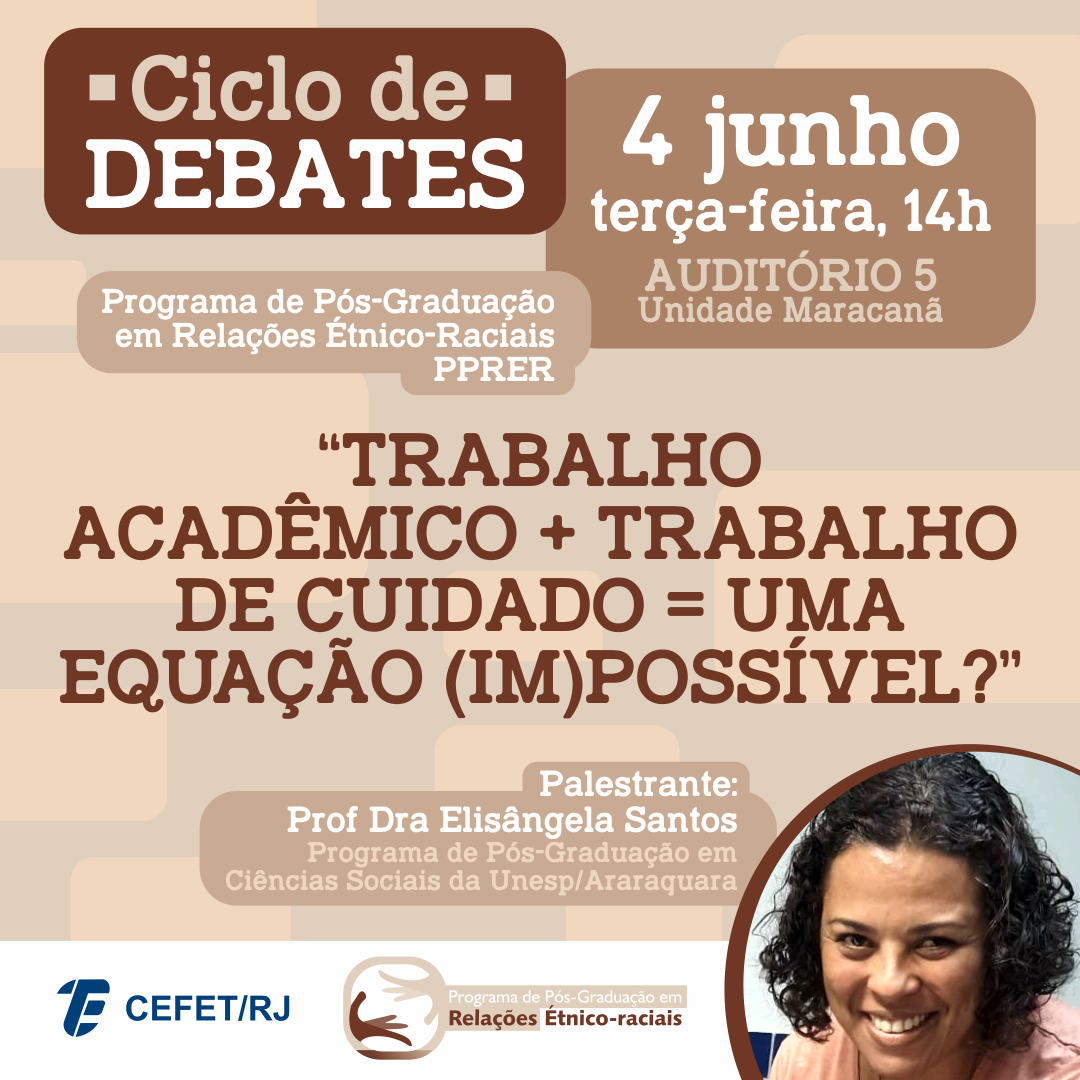 No dia 4 de junho, a palestra “Trabalho acadêmico + trabalho de cuidado = uma equação (im)possível?”, com a participação da professora e pesquisadora Elisângela Santos, irá inaugurar a programação do Ciclo de Debates do Programa de Pós-Graduação em Relações Étnico-Raciais (PPRER) em 2024. O evento é aberto ao público e terá início às 14h, no Auditório 5 da Unidade Maracanã (Bloco E, 5º andar).