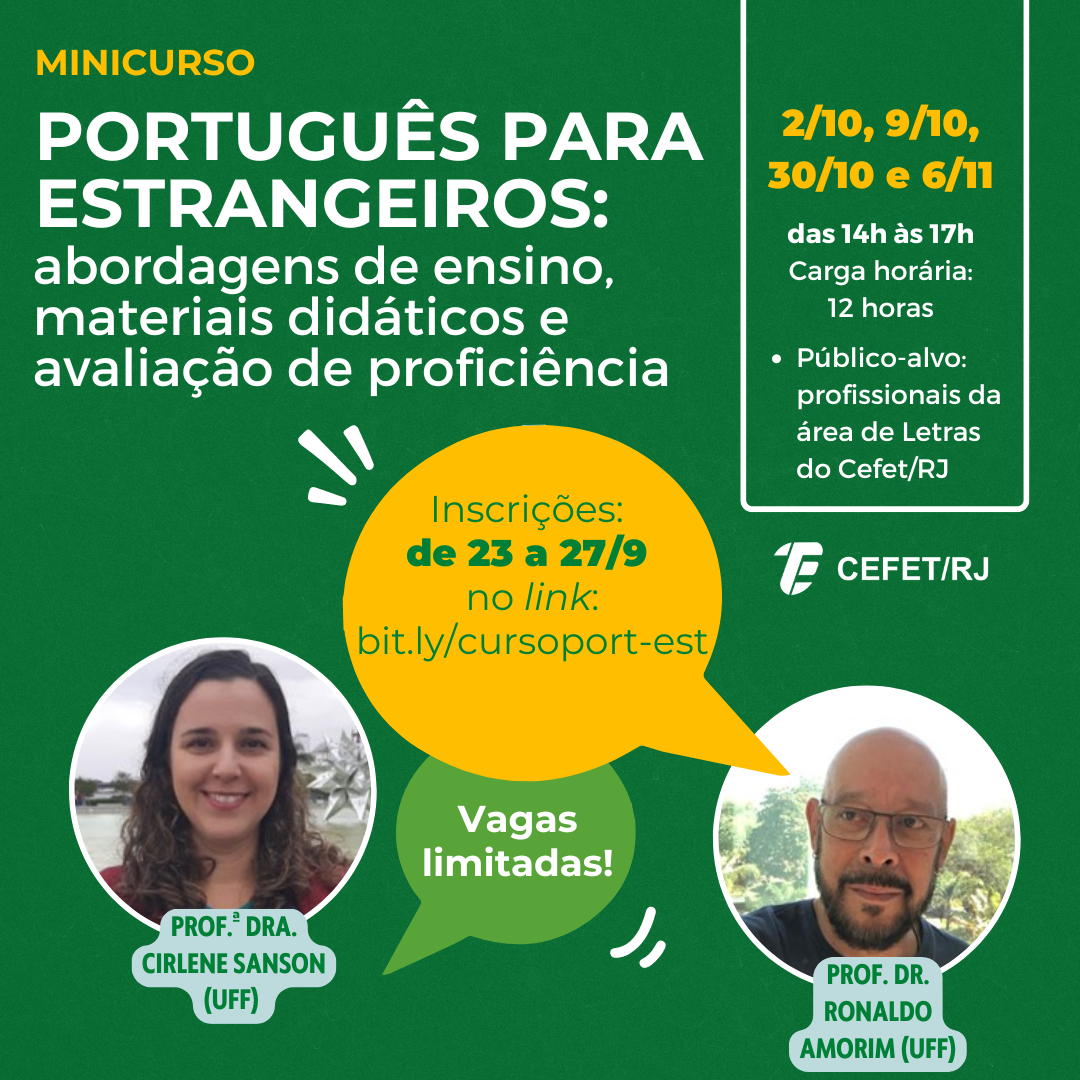 As aulas serão ministradas pela Prof.ª Dra. Cirlene Sanson (UFF) e pelo Prof. Dr. Ronaldo Amorim (UFF), membros da Comissão Técnico-Científica do Celpe-Bras. O Certificado de Proficiência em Língua Portuguesa para Estrangeiros (Celpe-Bras) é o exame brasileiro oficial para certificar proficiência em português como língua estrangeira e é aplicado semestralmente, no Brasil e no exterior, pelo Inep/MEC, em parceria com o Ministério das Relações Exteriores.