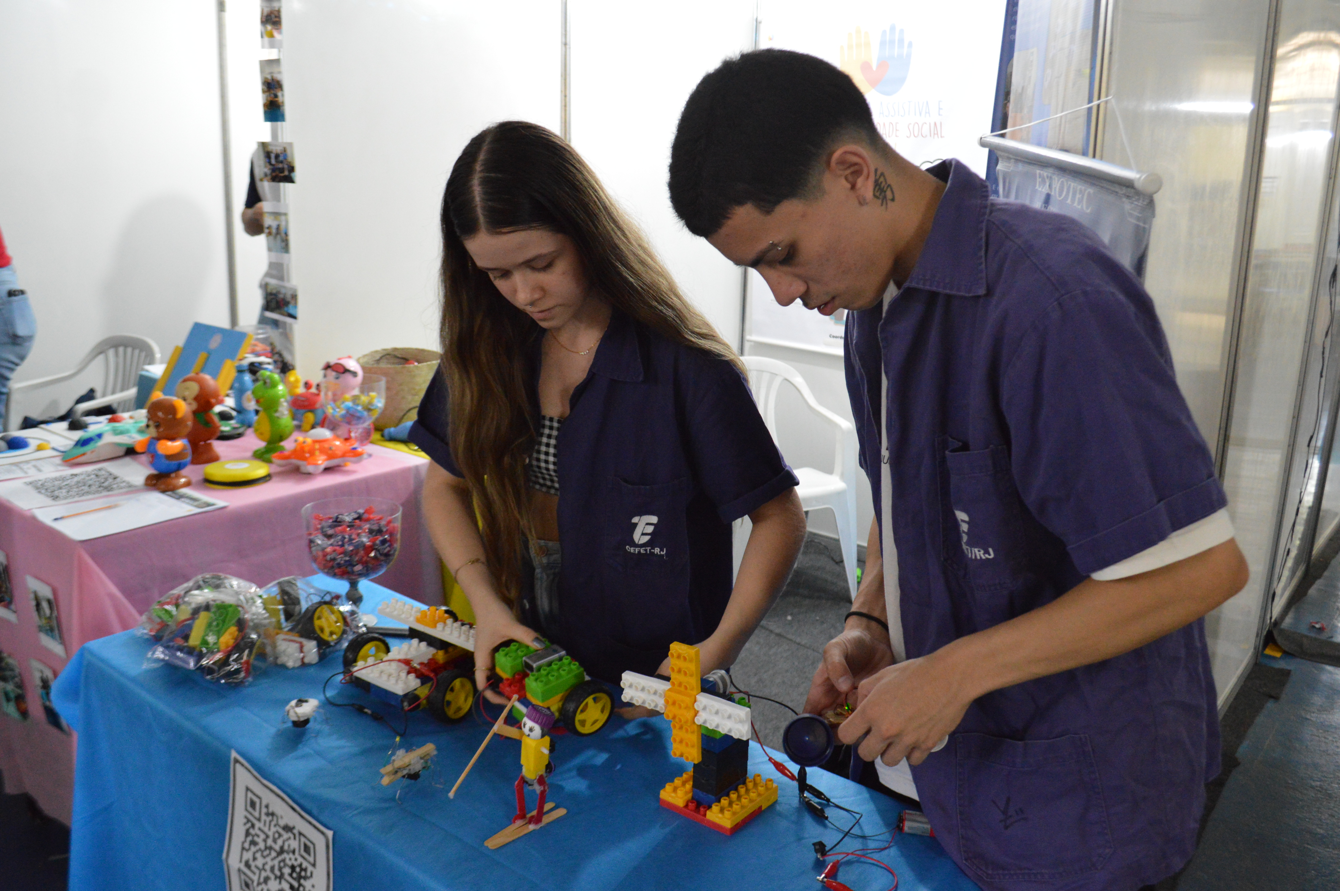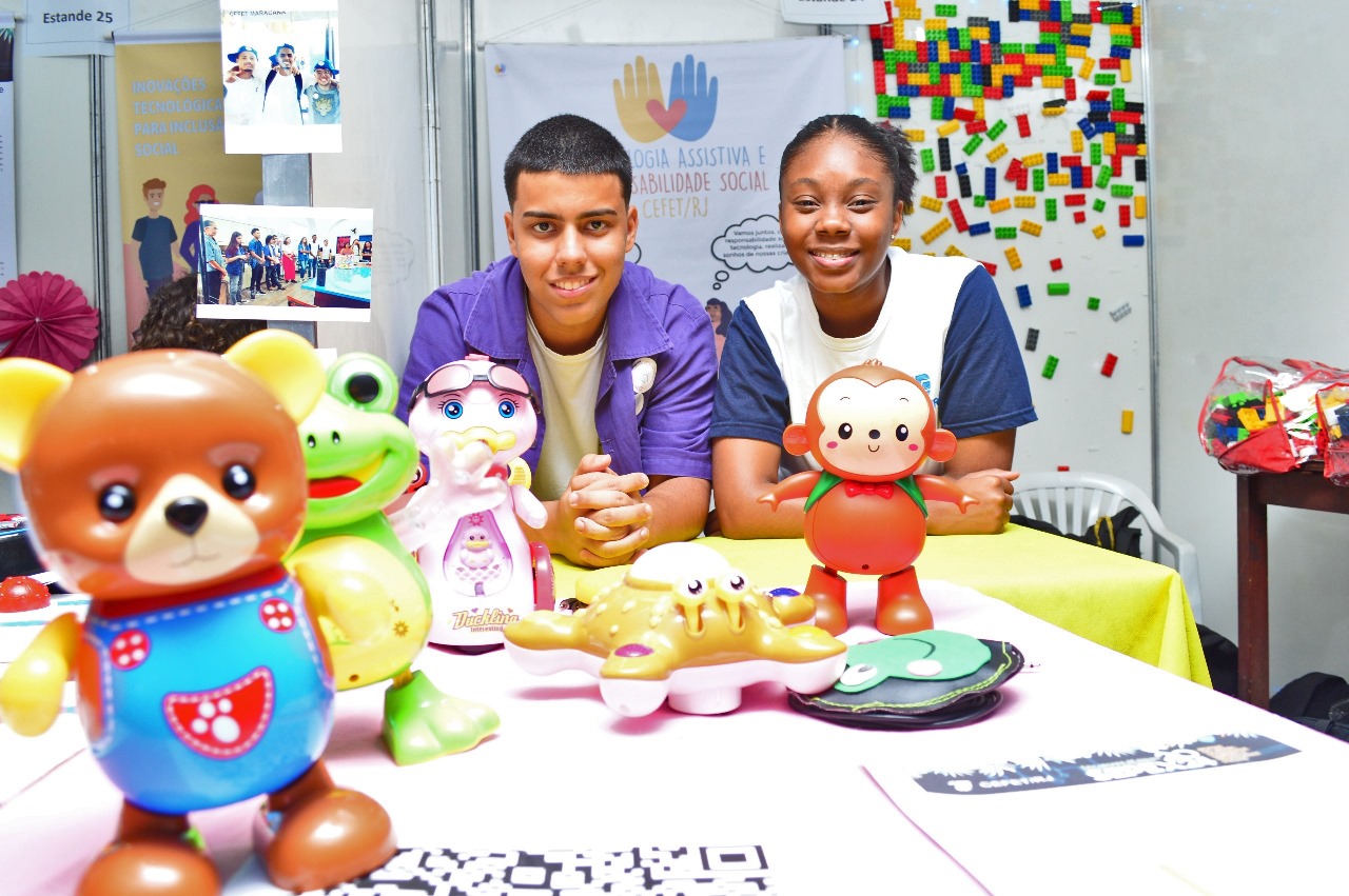 Maria Eduarda Nascimento e Felipe Gomes exibem os brinquedos adaptados pelos alunos do curso técnico em Eletrotécnica do Cefet/RJ