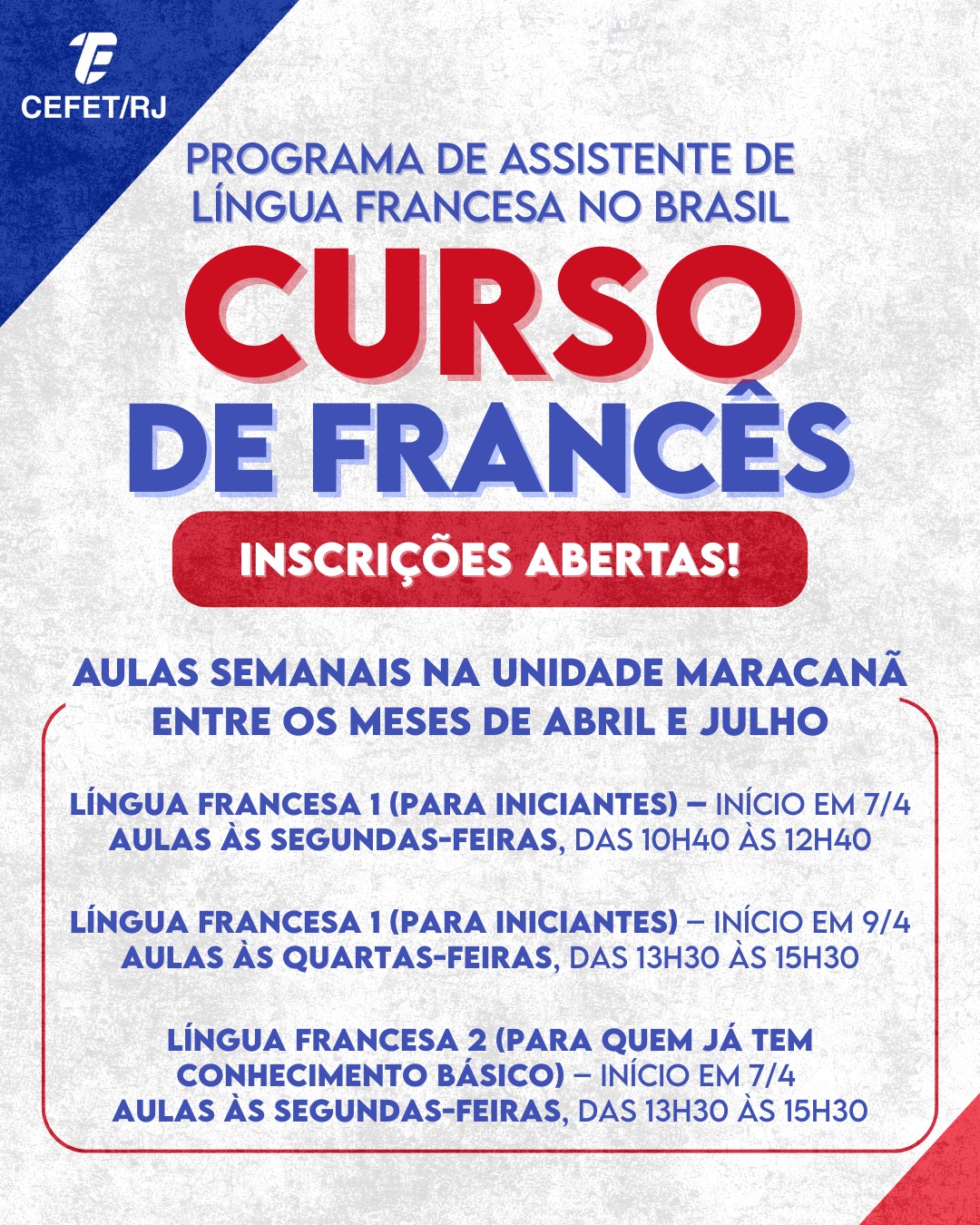 O Programa de Assistente de Língua Francesa abre inscrições para interessados em aprender o idioma. Estão disponíveis duas turmas para iniciantes e uma para alunos com conhecimento básico. O curso terá aulas semanais, com duas horas de duração, que acontecerão entre os meses de abril e julho na Unidade Maracanã. Os participantes terão direito a certificado.