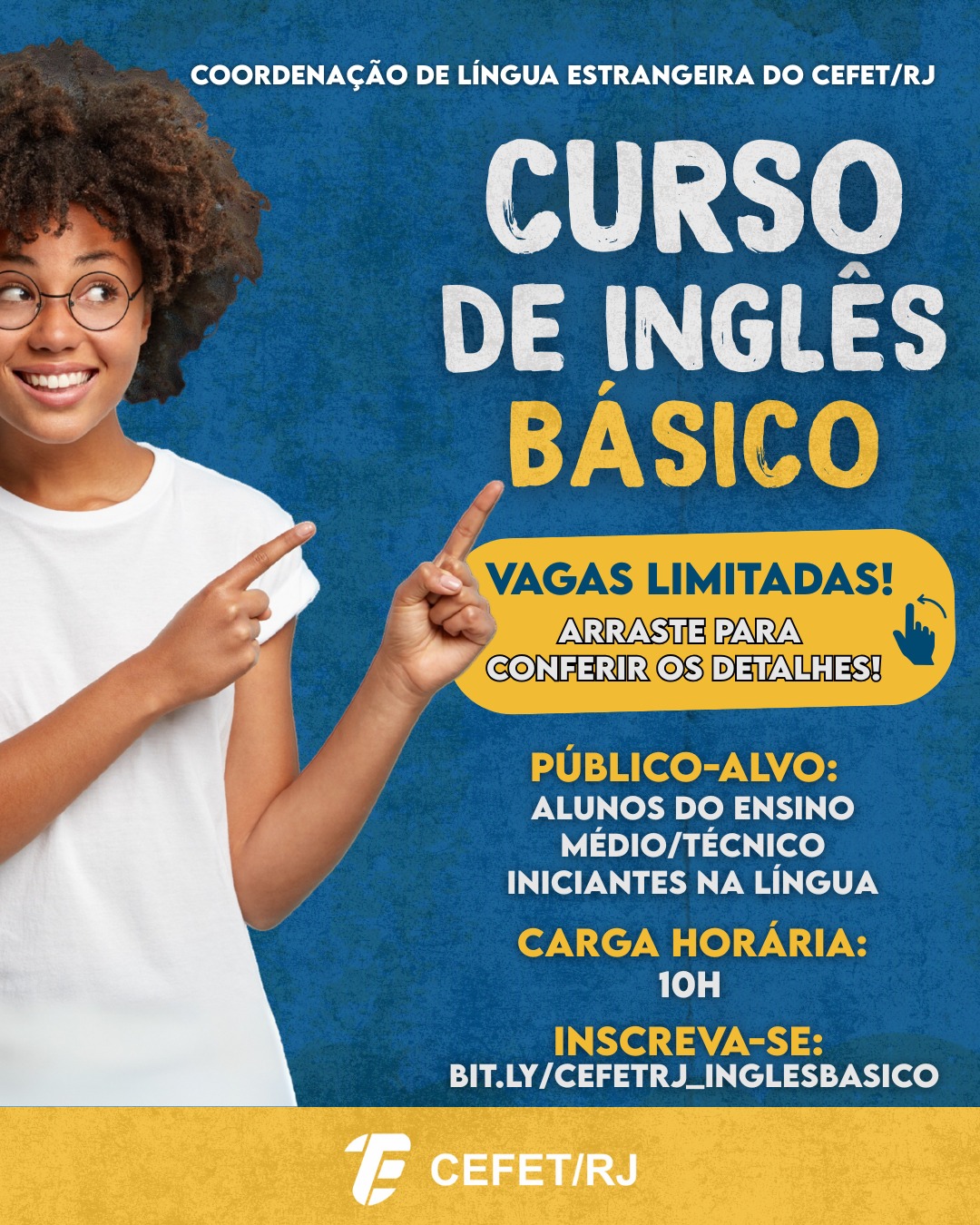 A Coordenação de Língua Estrangeira (COLIE) do Cefet/RJ abriu inscrições para duas turmas de inglês básico voltadas para alunos da educação profissional técnica de nível médio que sejam iniciantes no idioma. As inscrições devem ser realizadas por meio do formulário on-line disponível no link bit.ly/cefetrj_inglesbasico. As vagas são limitadas.