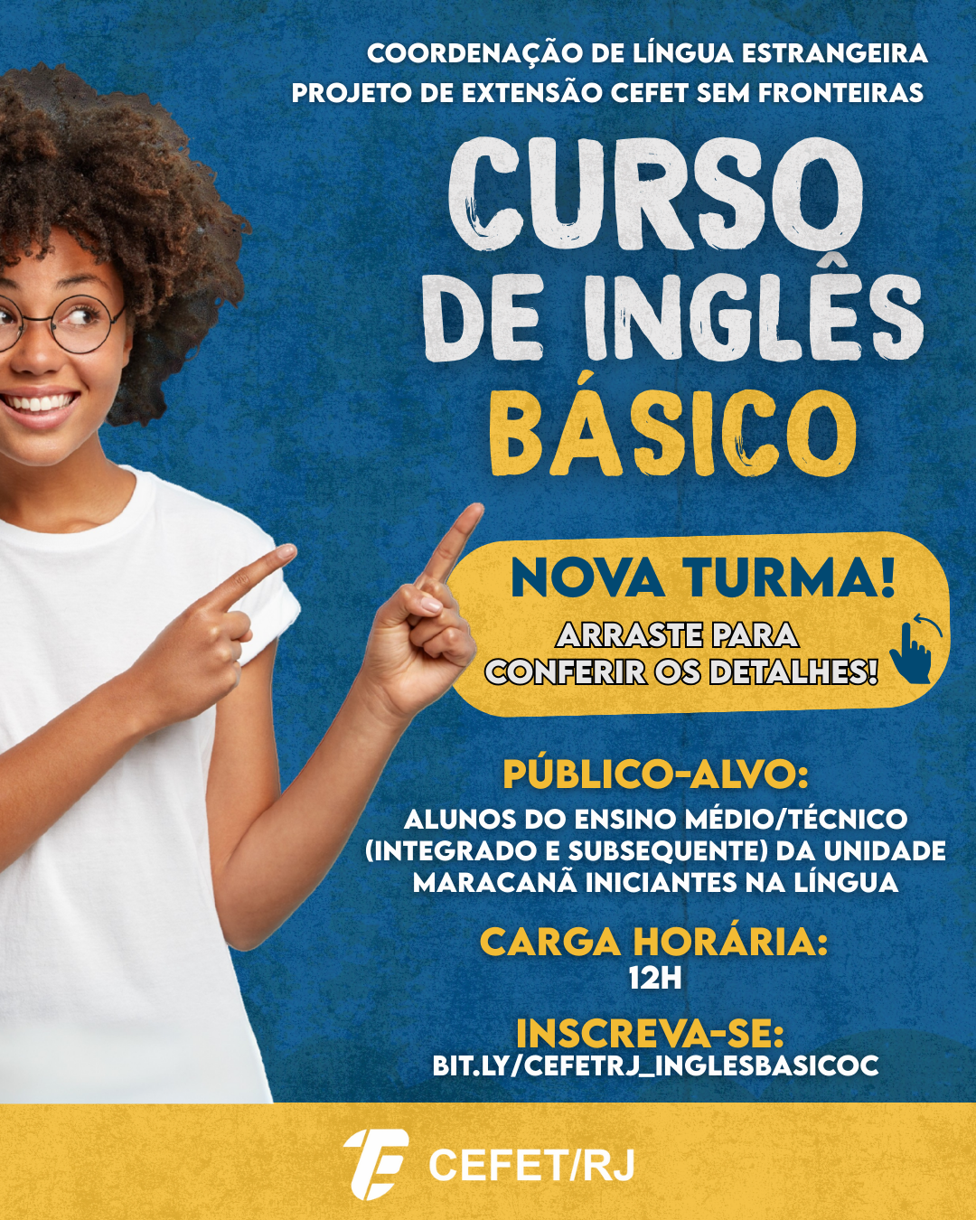 A Coordenação de Línguas Estrangeiras (COLIE) do Cefet/RJ, em parceria com o projeto de extensão CEFET Sem Fronteiras, está com inscrições abertas para uma nova turma do curso de inglês básico. Com carga horária total de 12 horas, o curso é direcionado exclusivamente aos alunos da educação profissional técnica integrada ao ensino médio e do subsequente da Unidade Maracanã que sejam iniciantes na língua.