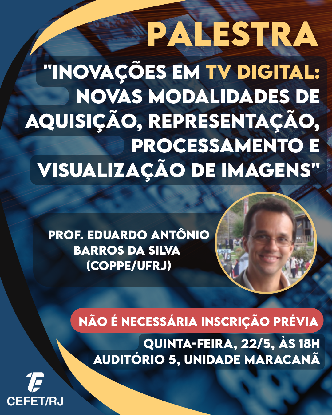 No dia 22 de maio, o Cefet/RJ realizará a palestra "Inovações em TV Digital: novas modalidades de aquisição, representação, processamento e visualização de imagens", ministrada pelo professor Eduardo Antônio Barros da Silva, doutor em Eletrônica e professor titular da Coppe/UFRJ. O evento será realizado no Auditório 5 da Unidade Maracanã, às 18h.