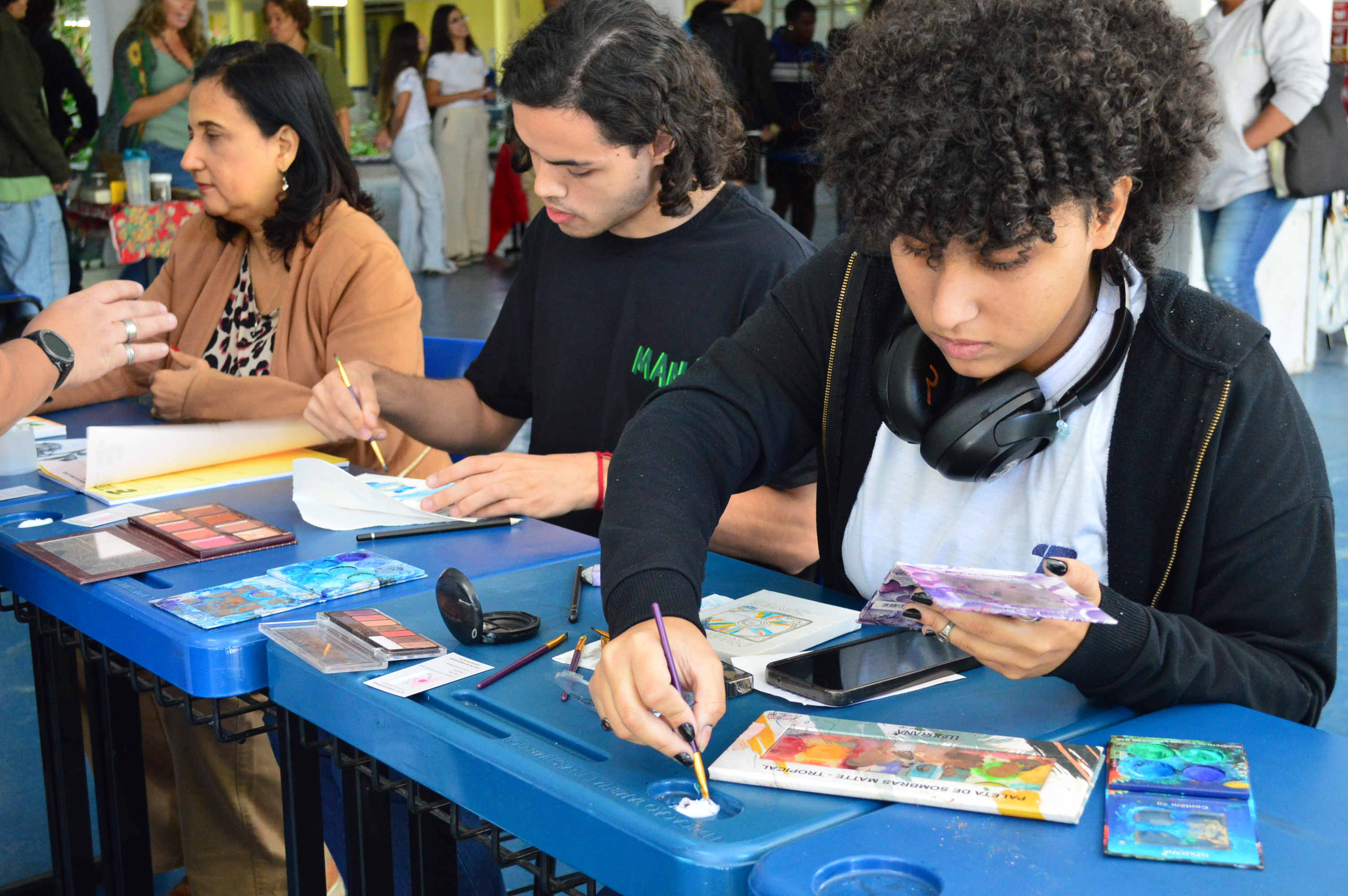 Na parte da manhã, no Pátio Azul, houve apresentação de projetos de extensão desenvolvidos por alunos, que destacam iniciativas sustentáveis como a separação de lixo reciclável, a redução do uso de plástico no dia a dia e o monitoramento de hortas urbanas. Também foi realizada uma oficina de pintura em tela, com a utilização de maquiagens fora do prazo de validade, incentivando o reaproveitamento de materiais que seriam descartados. “É um trabalho artístico que também estimula um modelo de consumo mais sustentável, de economia circular. Esse aprendizado ajuda a desenvolver talentos e abre oportunidades sociais e econômicas”, disse Aline Trigo.