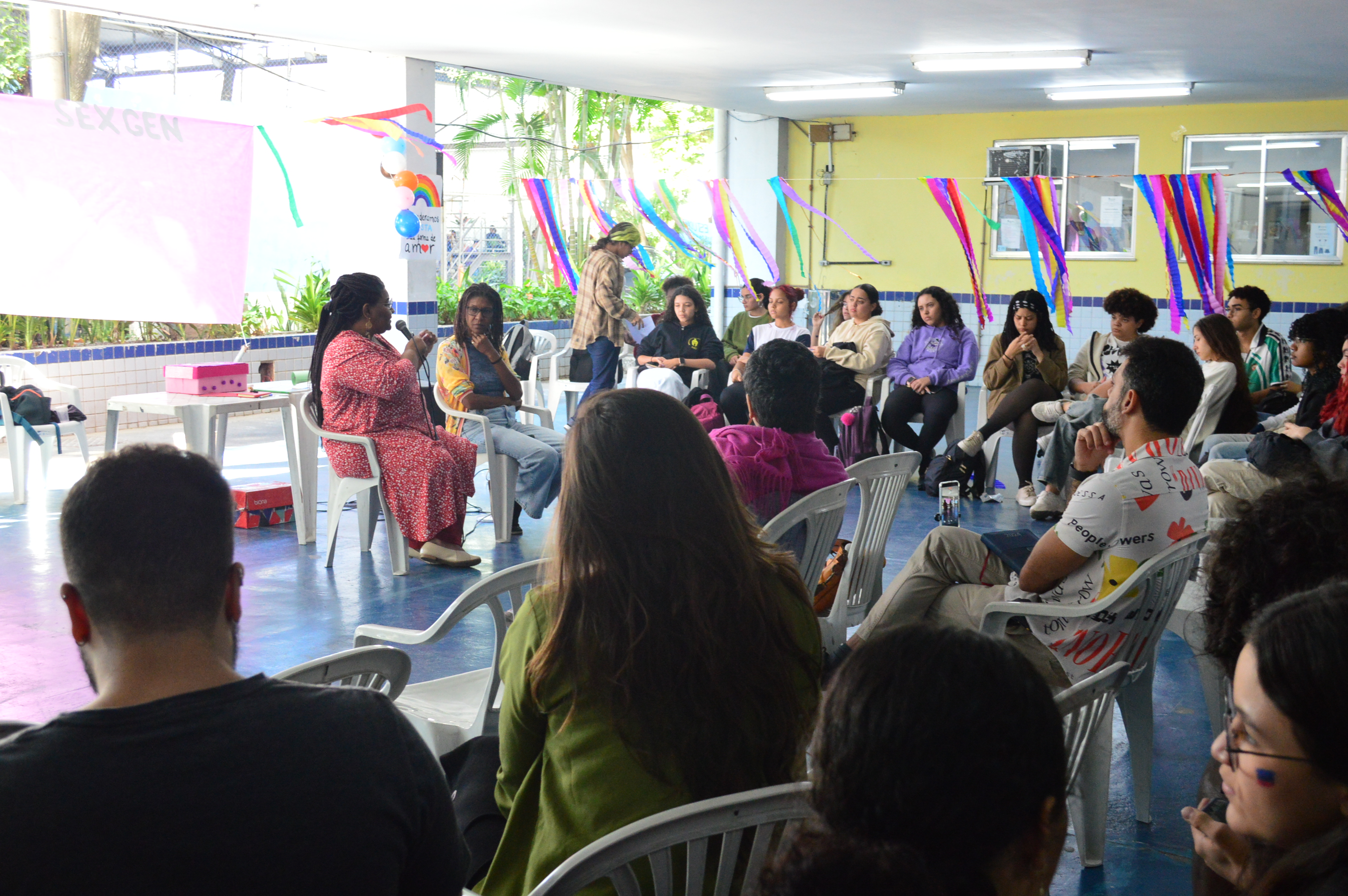 Foi realizada também uma dinâmica interativa, por meio de um quiz sobre diversidade, conduzido pelas bolsistas de extensão Maria Eduarda dos Santos – projeto “Conceituário da Juventude e Diversidade” – e Gabriela Nascimento – projeto “(Com)viver: identidades e sexualidades juvenis”. Além disso, o professor Thiago Rodrigues, coordenador do NUGEDS da Unidade Maracanã, realizou uma fala sobre profilaxia, tratamento e protocolo pós-exposição ao HIV, disponível no Sistema Único de Saúde.