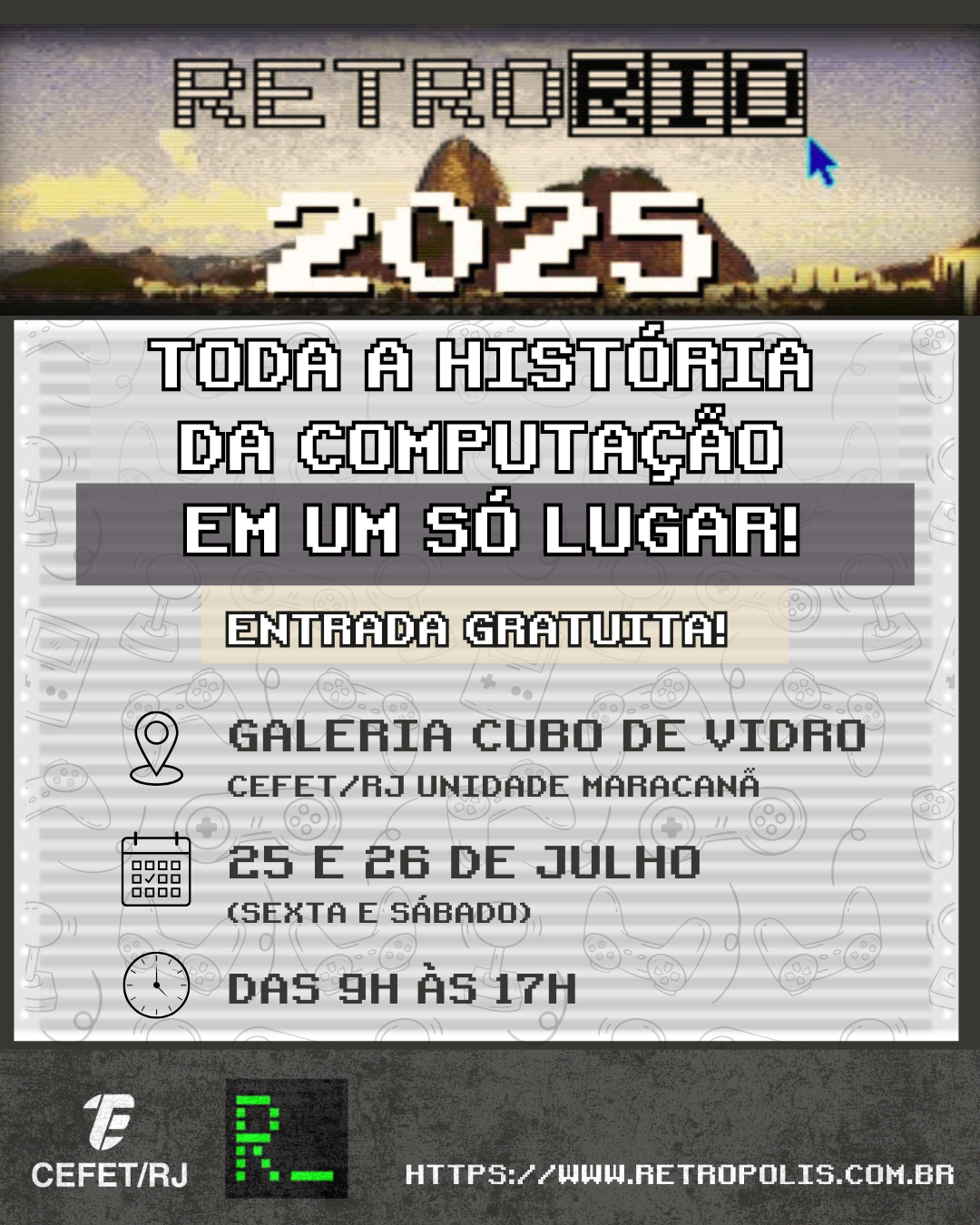 Nos dias 25 e 26 de julho, o Cefet/RJ sediará o evento RetroRio 2025, com apoio da Diretoria de Extensão (DIREX). A mostra reunirá entusiastas, colecionadores e pesquisadores interessados em computadores clássicos e videogames antigos, na Galeria Cubo de Vidro, na Unidade Maracanã, das 9h às 17h. A entrada é gratuita e o evento é aberto a toda a comunidade.