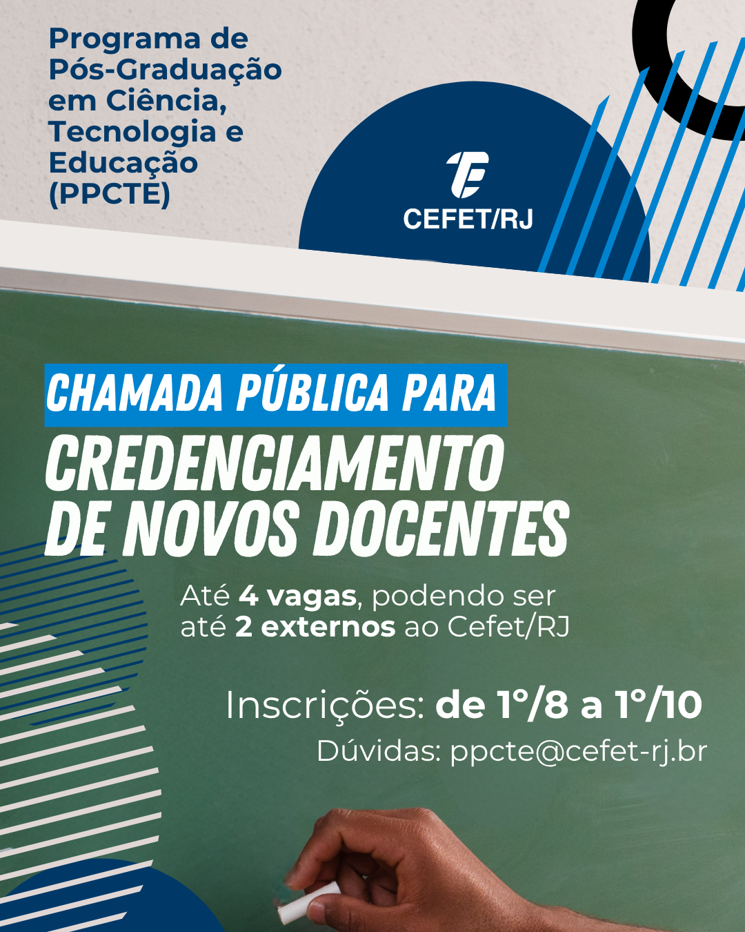 O Programa de Pós-Graduação em Ciência, Tecnologia e Educação (PPCTE) da Unidade Maracanã seleciona até quatro professores doutores, podendo ser até dois externos ao Cefet/RJ, para integrar o quadro de docentes. São ofertadas três vagas para docente colaborador e uma vaga para docente permanente, a serem credenciados, necessariamente, em uma das seguintes linhas do programa: L1 – História e Filosofia da Ciência e da Tecnologia do Ensino; L3 – Novas Abordagens em Educação e Tecnologia; L4 – Formação de Professores em Ciência, Tecnologia e Educação. As inscrições estarão abertas de 1º de agosto até 1º de outubro.