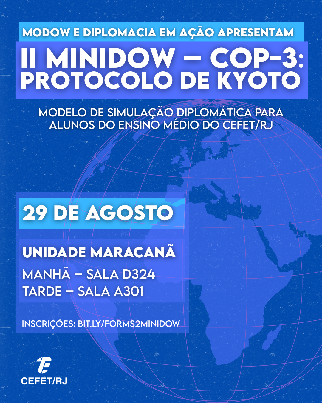 O II MiniDOW simulará o COP-3: Protocolo de Kyoto. Os alunos interessados poderão se inscrever para as atividades do período matutino (das 8h às 12h), que ocorrerão na Sala D324, ou vespertino (das 13h às 17h), que ocorrerão na Sala A301. Clique aqui para se inscrever.