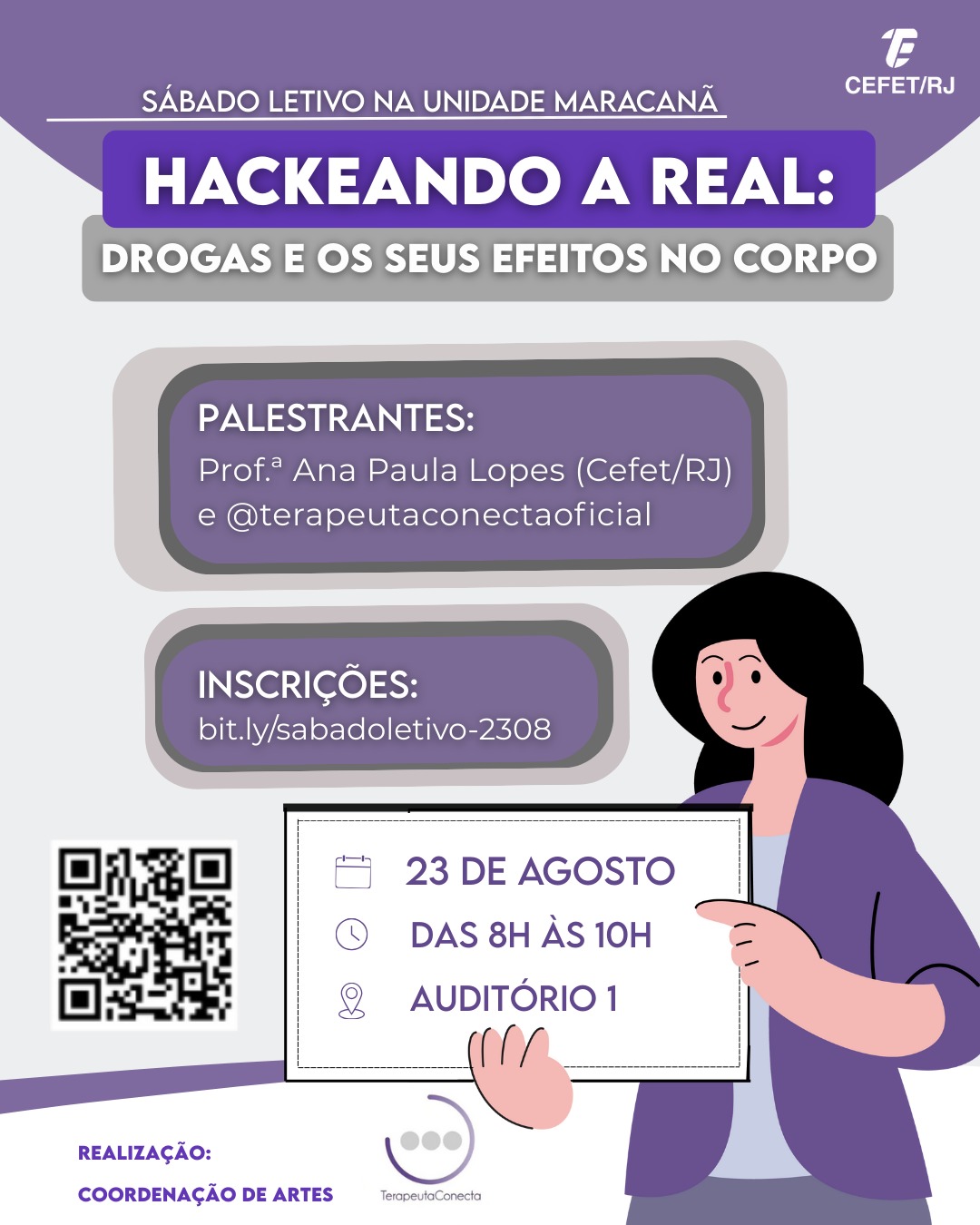 No primeiro sábado letivo após o retorno das férias, a Unidade Maracanã vai realizar a palestra “Hackeando a real: drogas e seus efeitos no corpo”. O evento é voltado a alunos do ensino médio/técnico e acontecerá no dia 23 de agosto, às 8h, no Auditório 1. A atividade será conduzida pela Coordenação de Artes (COARTES), com palestras da professora Ana Paula Lopes e de representantes da Terapeuta Conecta, plataforma digital que oferece apoio terapêutico para questões de dependência química e emocional.
