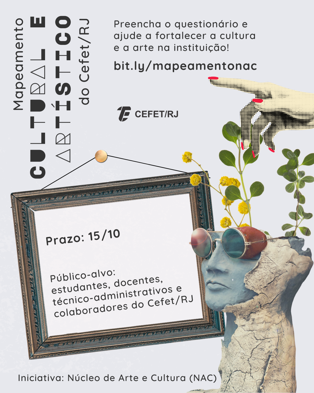 O Núcleo de Arte e Cultura (NAC) do Cefet/RJ convida toda a comunidade acadêmica (estudantes, docentes, técnico-administrativos e colaboradores) a participar do primeiro Mapeamento Cultural e Artístico da história da instituição. As informações coletadas até o dia 15 de outubro serão fundamentais para a formulação de políticas culturais institucionais, além de orientar a criação de ações, programas e eventos que valorizem a diversidade e o protagonismo cultural da comunidade interna.