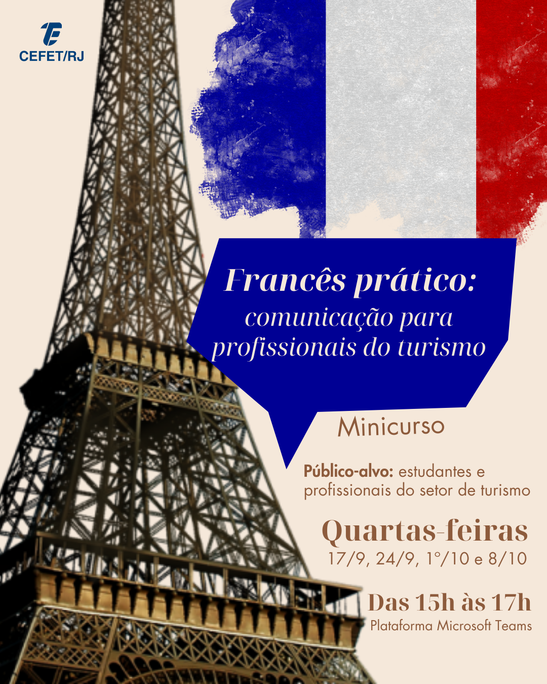 Estão abertas as inscrições, até o dia 13 de setembro, para o minicurso “Francês prático: comunicação para profissionais do turismo”. A atividade terá um total de 8 horas de duração e acontecerá em quatro encontros on-line pela plataforma Microsoft Teams, às quartas-feiras, nos dias 17 e 24 de setembro e 1º e 8 de outubro, das 15h às 17h. Serão oferecidas 25 vagas a serem preenchidas por ordem de inscrição.