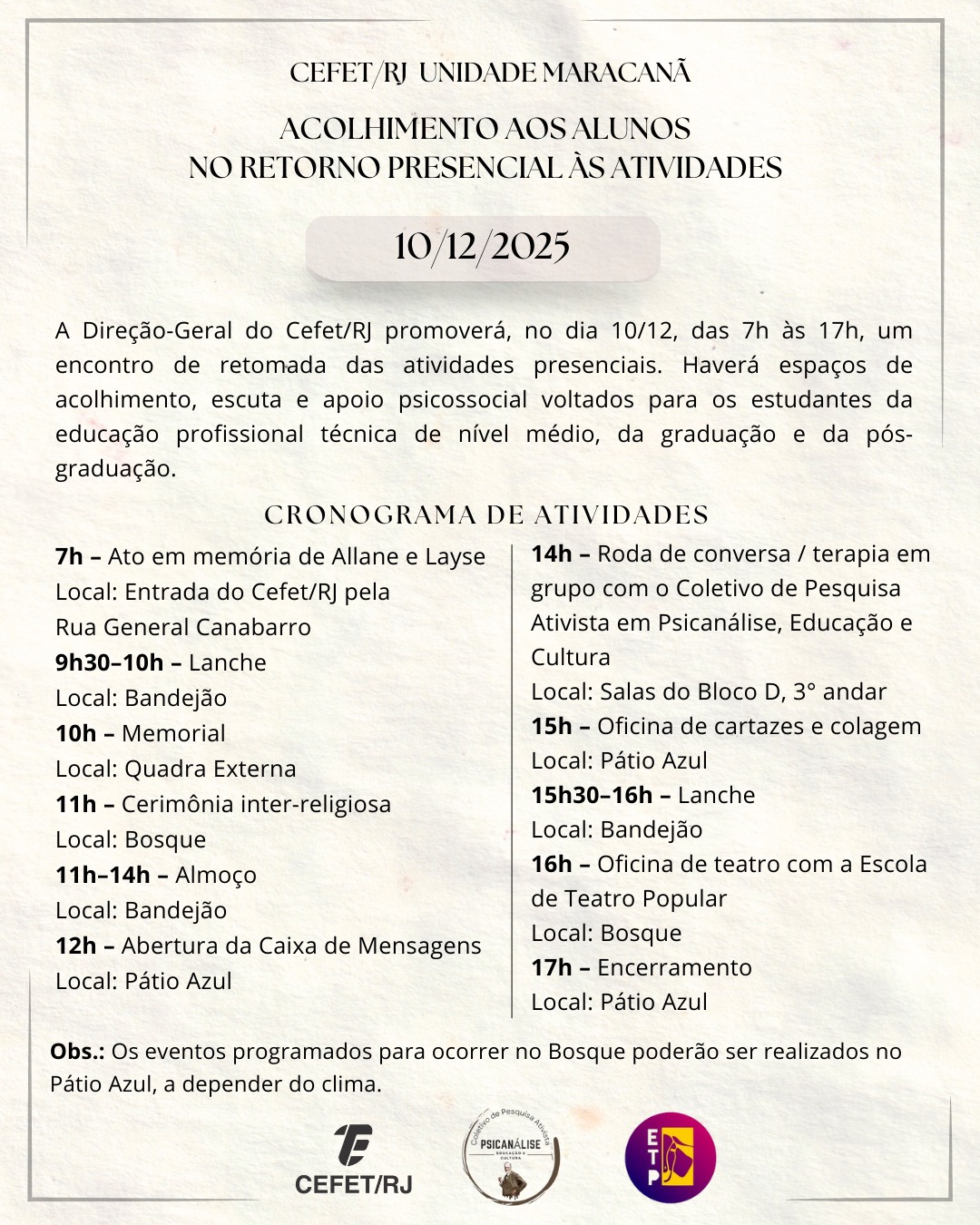 A Direção-Geral do Cefet/RJ informa que, na quarta-feira (10), terá início o gradual retorno presencial dos estudantes da educação profissional técnica de nível médio, da graduação e da pós-graduação da Unidade Maracanã. Marcando esse momento, nesse dia, será realizada uma programação especial de acolhimento, dedicada a oferecer suporte emocional, pedagógico e momentos de reflexão e diálogo aos alunos. Não haverá aula nem aplicação de provas nessa data.