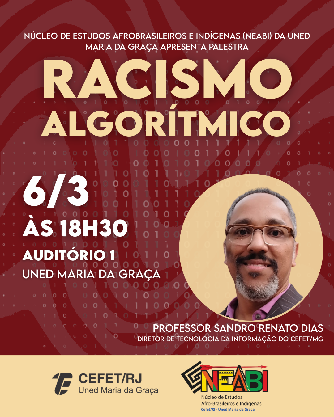 O Núcleo de Estudos Afrobrasileiros e Indígenas (NEABI) da Uned Maria da Graça fará a abertura das atividades de 2026 nesta sexta-feira, 6/3, com a palestra “Racismo Algorítmico”. A temática será apresentada pelo professor Sandro Renato Dias, diretor de Tecnologia da Informação do Centro Federal de Educação Tecnológica de Minas Gerais (Cefet/MG). A atividade é aberta ao público e acontecerá no Auditório 1 da unidade, às 18h30.