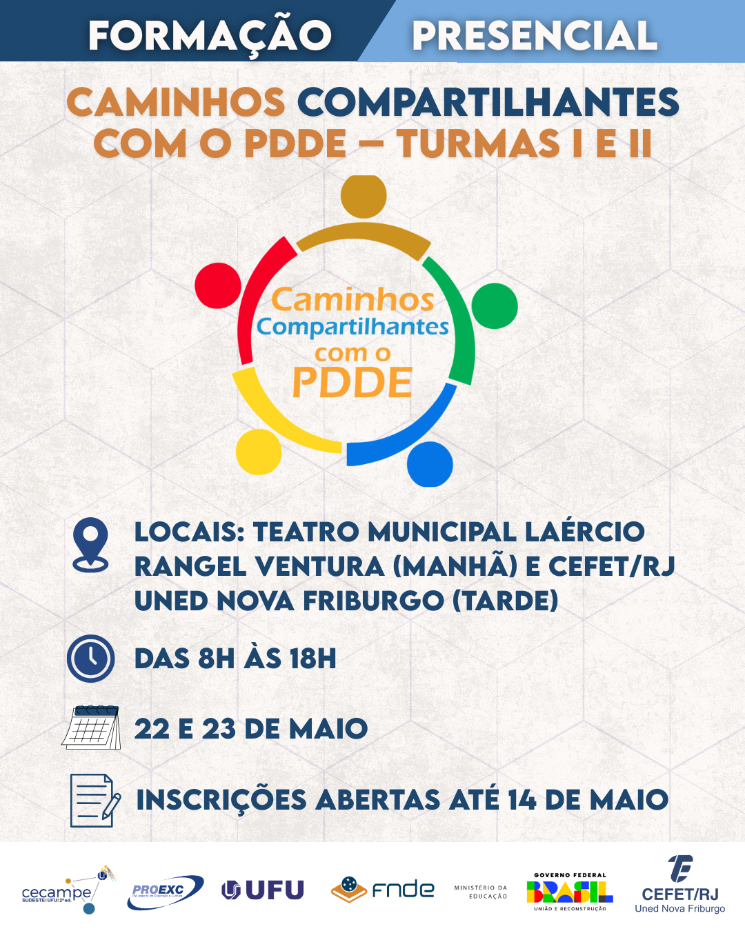 Nos dias 22 e 23 de maio, a Uned Nova Friburgo do Cefet/RJ vai sediar o curso de formação para gestores e educadores escolares intitulado “Caminhos compartilhantes com o Programa Dinheiro Direto na Escola (PDDE)”, que será dividido em duas turmas, uma em cada dia de evento. As inscrições serão realizadas até o dia 14 de maio.