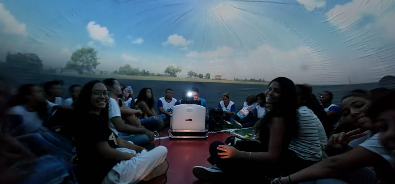 Público acompanha projeção do céu dentro do planetário inflável durante a atividade de astronomia