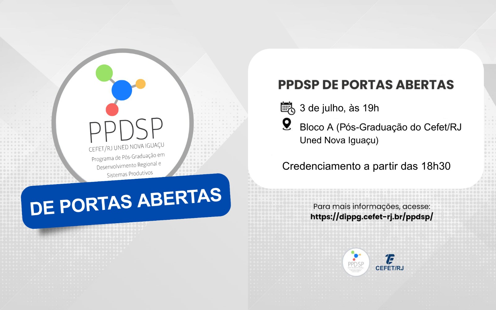 O Programa de Pós-Graduação em Desenvolvimento Regional e Sistemas Produtivos (PPDSP), oferecido pelo Cefet/RJ Uned Nova Iguaçu, promove, no dia 3 de julho, a atividade “PPDSP de Portas Abertas”. O evento terá início às 19h, no Bloco A da unidade, com credenciamento a partir das 18h30.