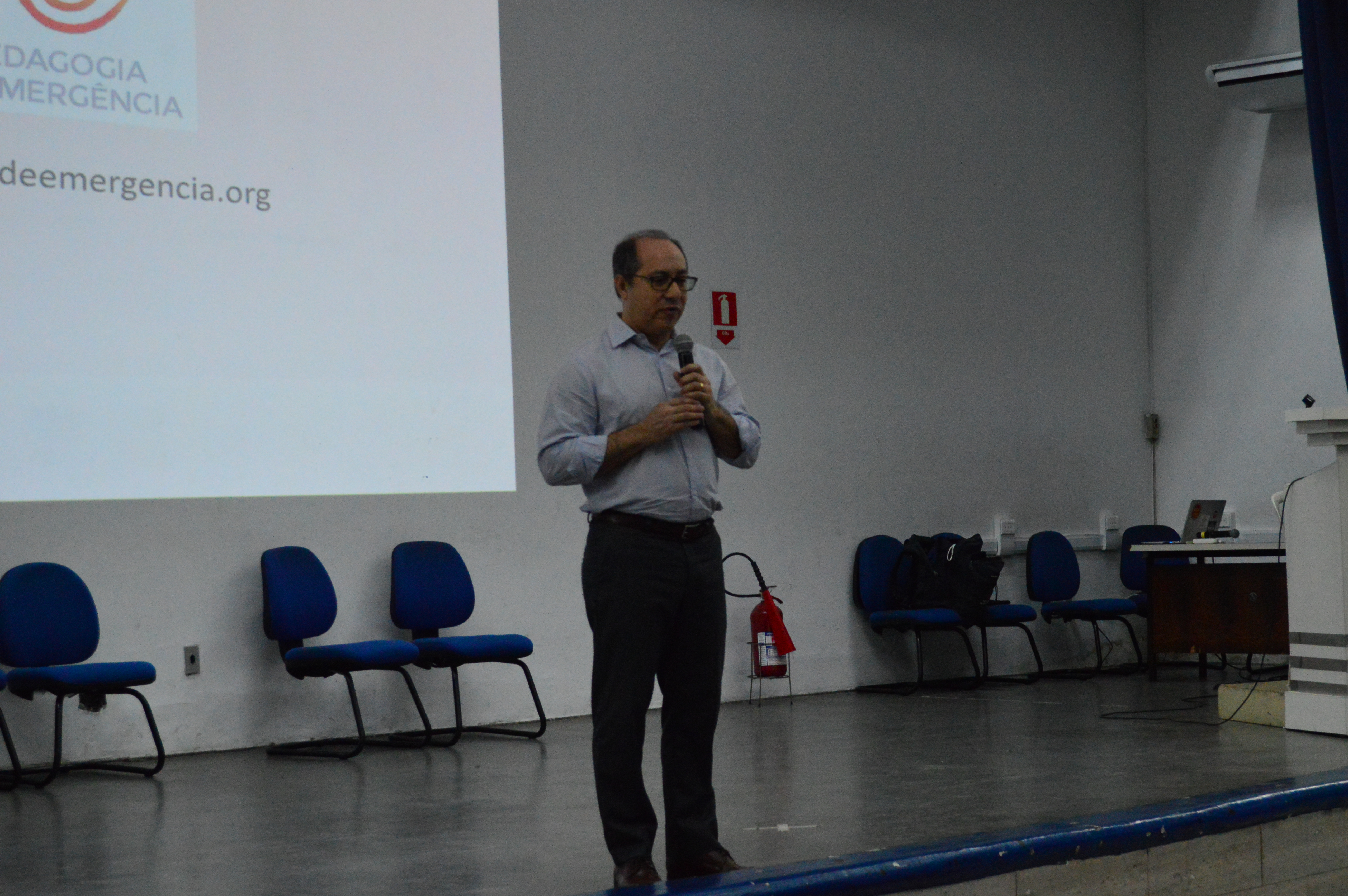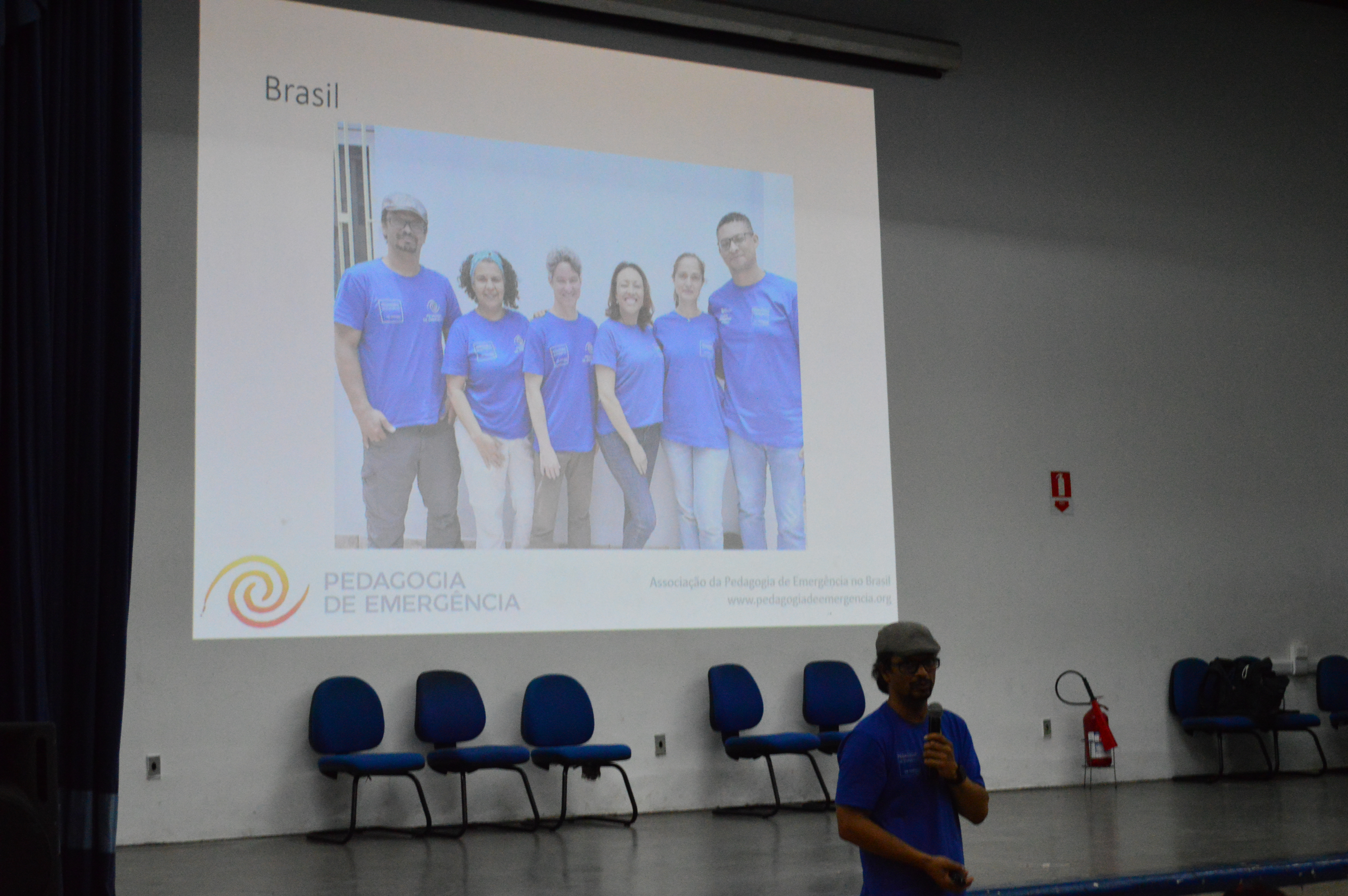 O evento de abertura seguiu com a palestra de Reinaldo Nascimento, psicólogo da Associação da Pedagogia de Emergência no Brasil, sobre o tema “Pedagogia de Emergência: o que fazer quando a ferida afeta a nossa alma?”. Durante sua fala, Nascimento apresentou os conceitos de trauma, seus diversos tipos e fases após um evento traumático extremo e, também, explicou as maneiras como os profissionais da educação podem se apoiar e dar suporte a estudantes que acabaram de passar por um evento traumático. O psicólogo sintetizou que “o trabalho pedagógico tem que ocorrer junto com o terapêutico”. A Pedagogia de Emergência é uma metodologia voltada principalmente a crianças e jovens e visa auxiliá-los a superarem feridas emocionais causadas por situações extremas, como guerras, violência em áreas urbanas e desastres naturais.