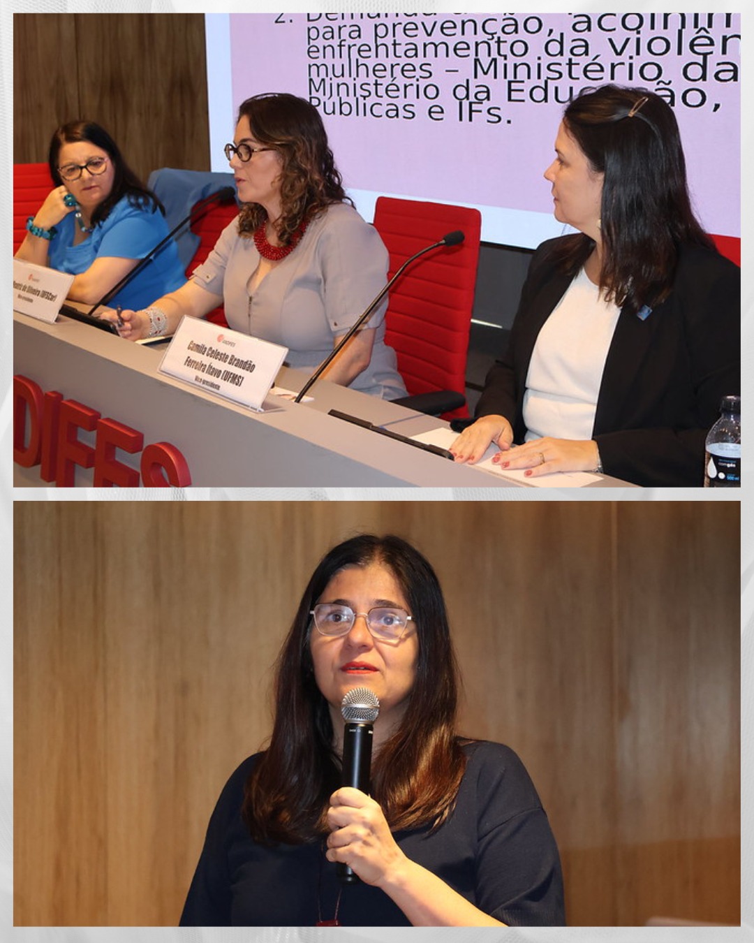 A vice-diretora-geral do Cefet/RJ, Gisele Vieira, participou, na última segunda-feira (26), de um encontro nacional que reuniu reitoras e vice-reitoras para debater a construção do Protocolo de Intenções para Prevenção, Acolhimento e Enfrentamento da Violência contra as Mulheres nas Universidades Federais. A reunião aconteceu em Brasília e foi articulada pelo Ministério das Mulheres, pelo Ministério da Educação e pela Associação Nacional dos Dirigentes das Instituições Federais de Ensino Superior (Andifes).