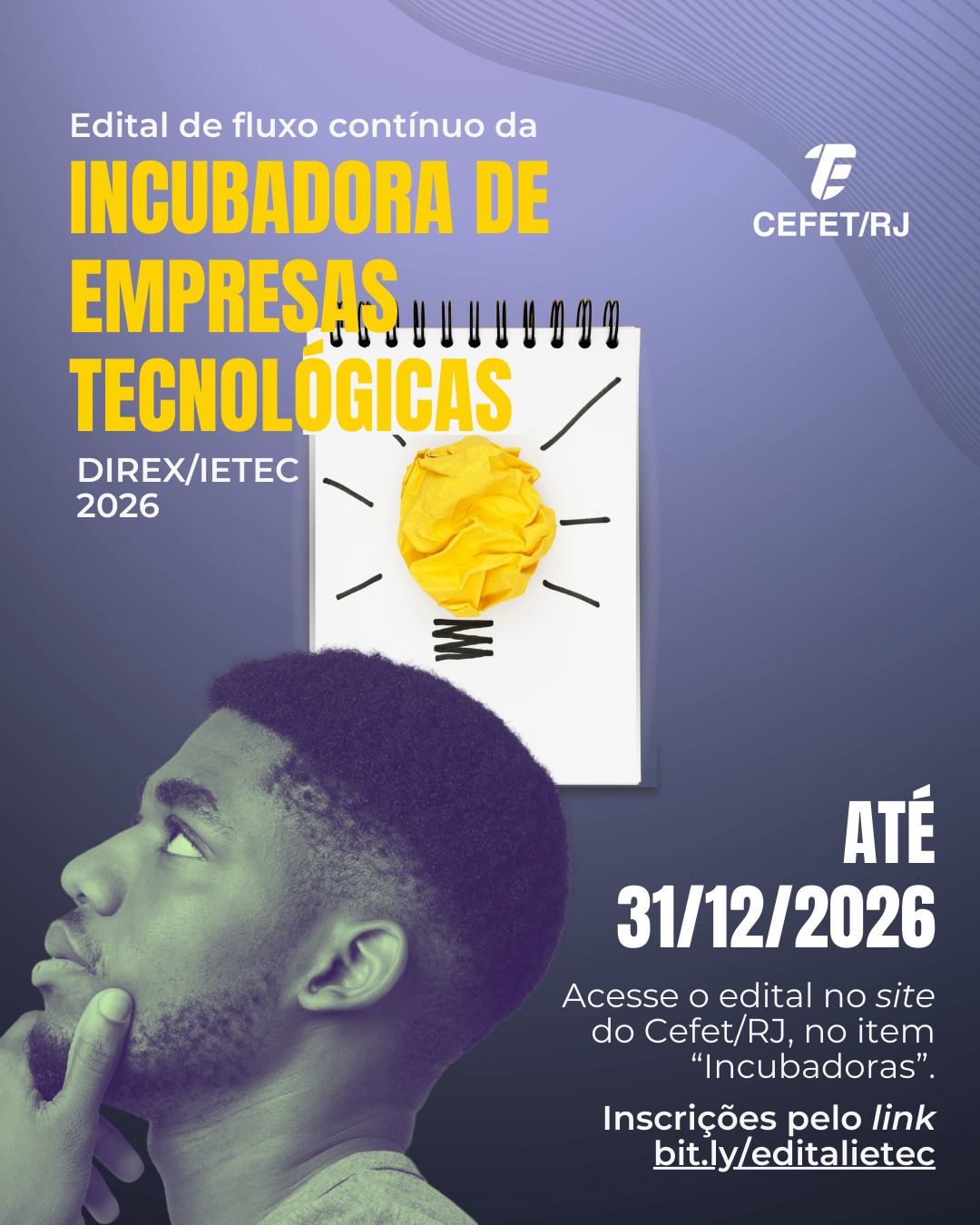 A Diretoria de Extensão (DIREX) do Cefet/RJ oficializou a abertura do edital de fluxo contínuo para a Incubadora de Empresas Tecnológicas (IETEC), com o objetivo de selecionar novos projetos para o Programa de Incubação. Conforme previsto no edital DIREX/IETEC, os proponentes podem apresentar seus projetos ao longo de todo o ano, com inscrições abertas até 31 de dezembro de 2026.