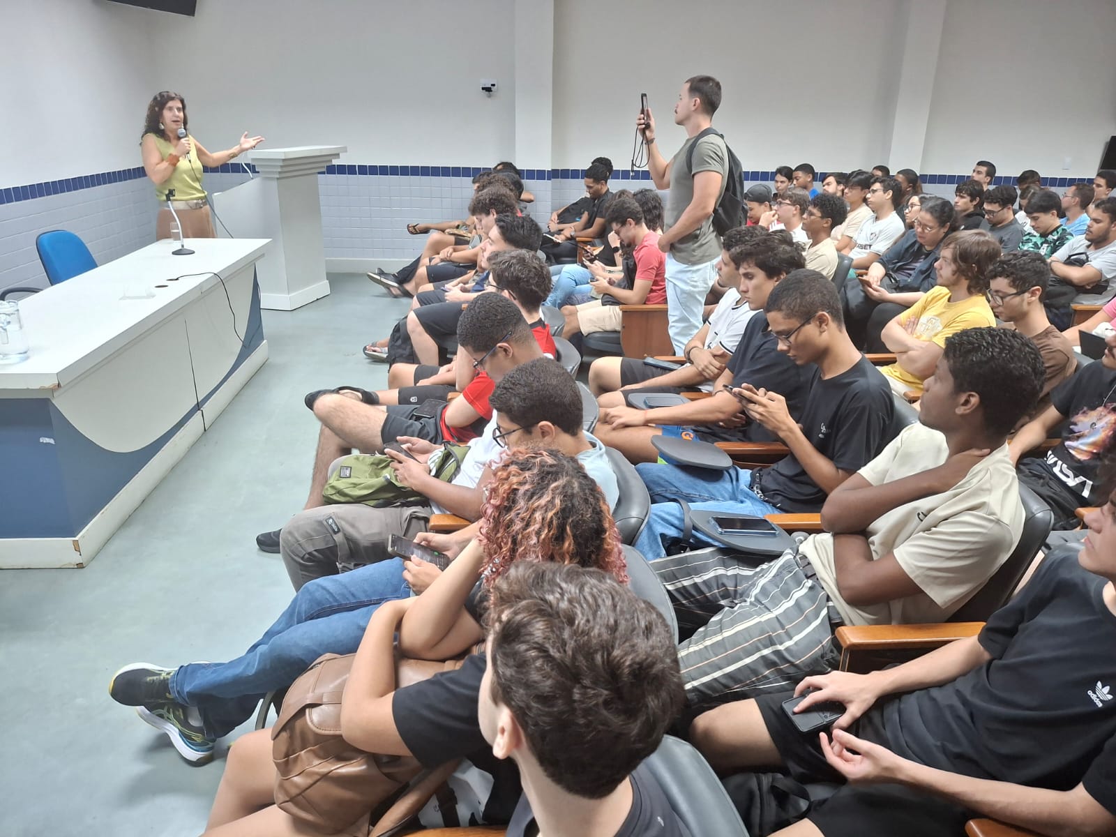 Com o auditório lotado, a secretária municipal de Ciência, Tecnologia e Inovação do Rio de Janeiro, Tatiana Roque, apresentou o Programa Jovens Cientistas Cariocas a alunos da graduação do Cefet/RJ