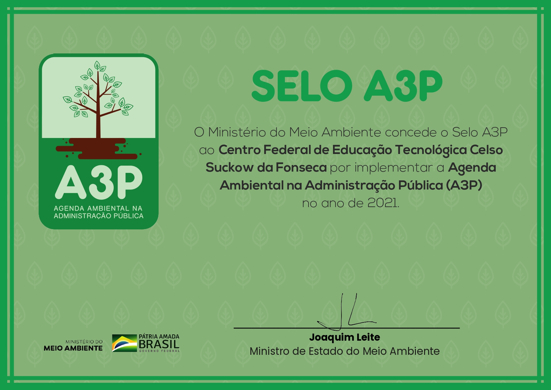 O Cefet/RJ recebeu, no dia 8 de abril, o Selo de Monitoramento do programa Agenda Ambiental na Administração Pública (A3P), do Ministério do Meio Ambiente, cujo objetivo é incentivar órgãos públicos do país a implantarem ações de responsabilidade socioambiental em suas atividades internas e externas. A instituição aderiu formalmente à agenda em janeiro de 2018 e já recebeu três selos.