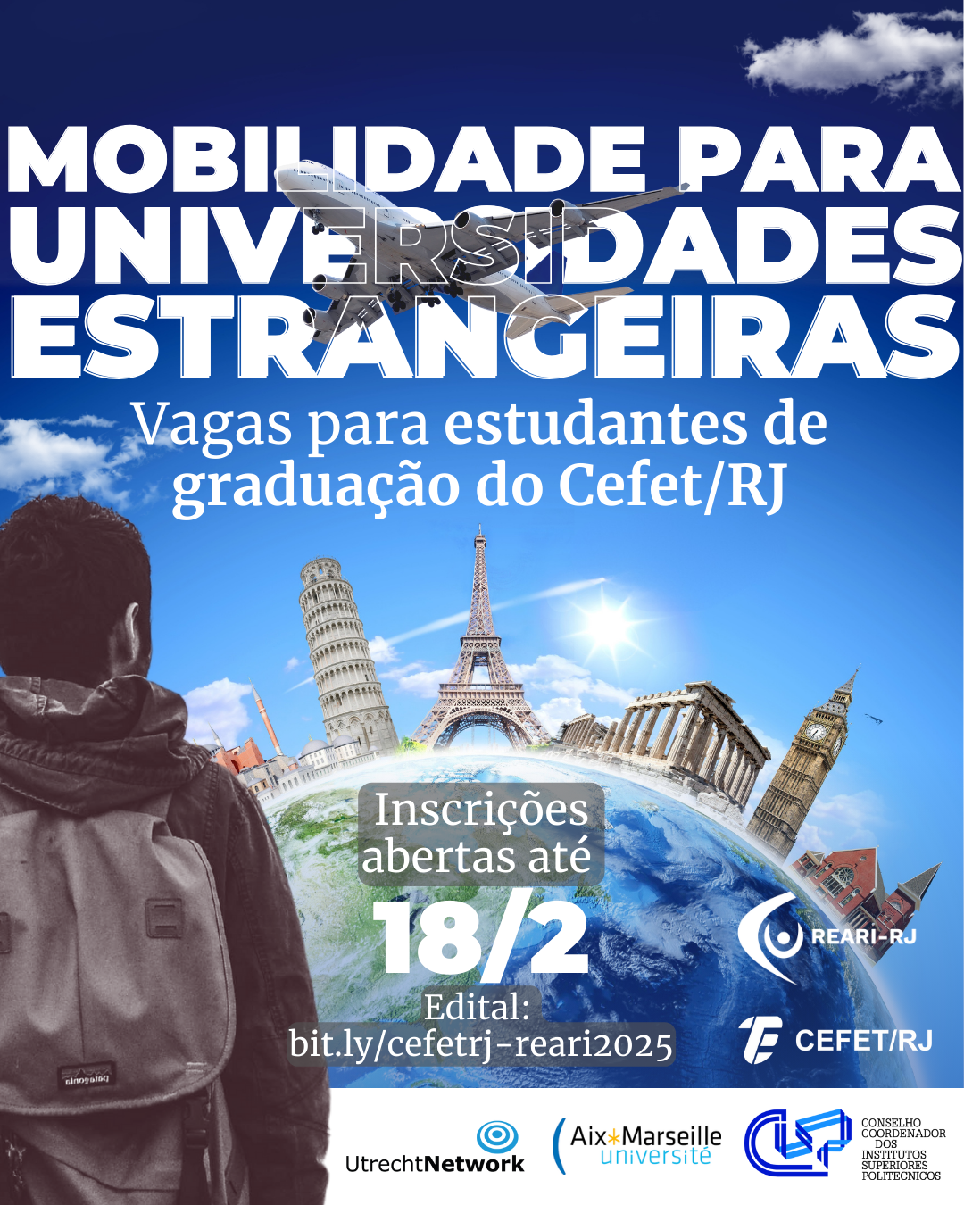 A Rede de Assessorias Internacionais das Instituições de Ensino Superior do Estado do Rio de Janeiro (REARI-RJ) está com inscrições abertas para um programa de mobilidade internacional em universidades de 17 países da União Europeia. A oportunidade é destinada a estudantes de graduação do Cefet/RJ e de outras sete instituições públicas do Rio de Janeiro que integram a REARI-RJ. O prazo para candidatura se encerra em 18 de fevereiro, e o intercâmbio terá duração de seis meses, com início previsto para setembro de 2025 ou janeiro/fevereiro de 2026.