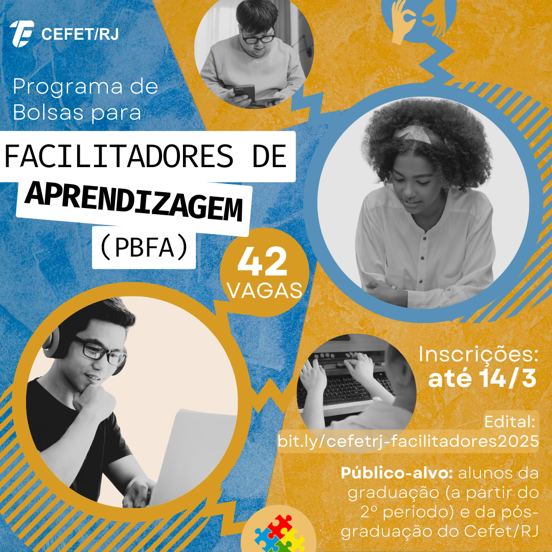 A Diretoria de Ensino (DIREN) do Cefet/RJ divulgou, nesta segunda-feira (10), as inscrições para estudantes interessados em participar do Programa de Bolsas para Facilitadores de Aprendizagem (PBFA). A iniciativa tem como objetivo acompanhar alunos com deficiência e/ou transtorno de aprendizagem na realização de atividades pedagógicas e na interação com o professor. Ao todo, são ofertadas 42 vagas imediatas, distribuídas entre todas as unidades da instituição, além da formação de um cadastro de reserva. Os candidatos devem preencher o formulário disponível no link https://forms.office.com/r/qLLJ6HK31M até o dia 14 de março e seguir as orientações do edital.