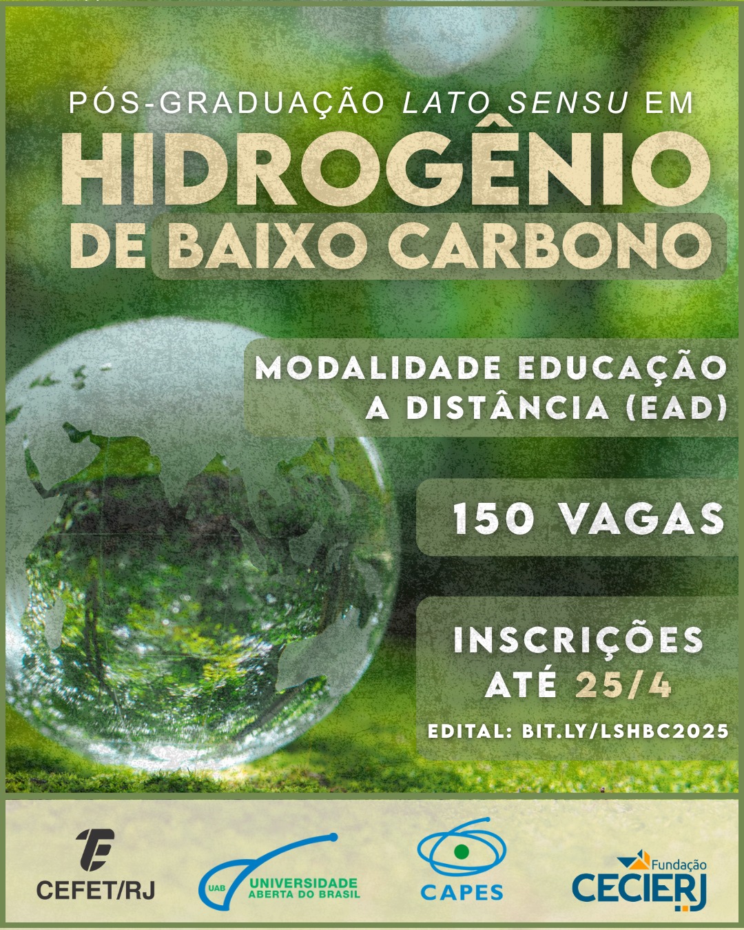 Estão abertas, até 25 de abril, as inscrições para a primeira turma da pós-graduação lato sensu em Hidrogênio de Baixo Carbono na modalidade educação a distância (EAD). Os candidatos deverão possuir curso superior completo reconhecido pelo Ministério da Educação (MEC) em Engenharias, Ciências Exatas e da Terra, Ciências Agrárias ou Ciências Sociais Aplicadas. Os interessados devem se inscrever pelo site https://processoseletivo.cefet-rj.br. O curso é ofertado via sistema Universidade Aberta do Brasil (UAB), organizado pela Coordenação de Aperfeiçoamento de Pessoal de Nível Superior (CAPES) e pela Fundação Cecierj/Consórcio Cederj.