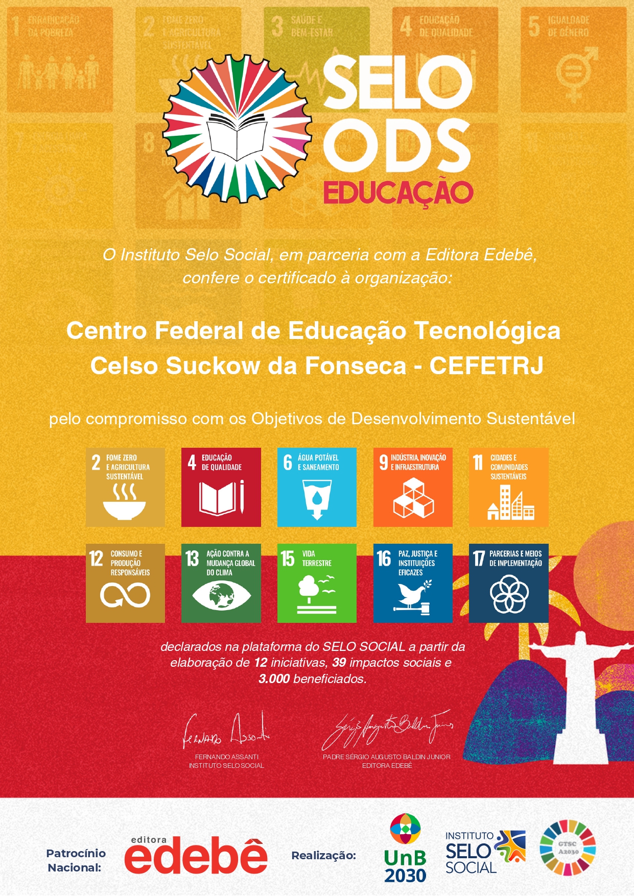 No ano de 2024, o Cefet/RJ foi certificado novamente com o SELO ODS EDUCAÇÃO que estimula a participação efetiva da instituição no alcance das metas da Agenda 2030, a partir da incorporação dos ODS nas ações de gestão, ensino, pesquisa e extensão. Foram 12 projetos institucionais que colaboraram para a certificação nacional do CEFET/RJ. A premiação (Figura abaixo) ocorreu no dia 20 de março de 2025 no Museu do Amanhã (Rio de Janeiro). No ano de 2023, a instituição de ensino já havia sido reconhecida com um projeto do grupo de extensão ENACTUS CEFET/RJ - nome ODOYA.