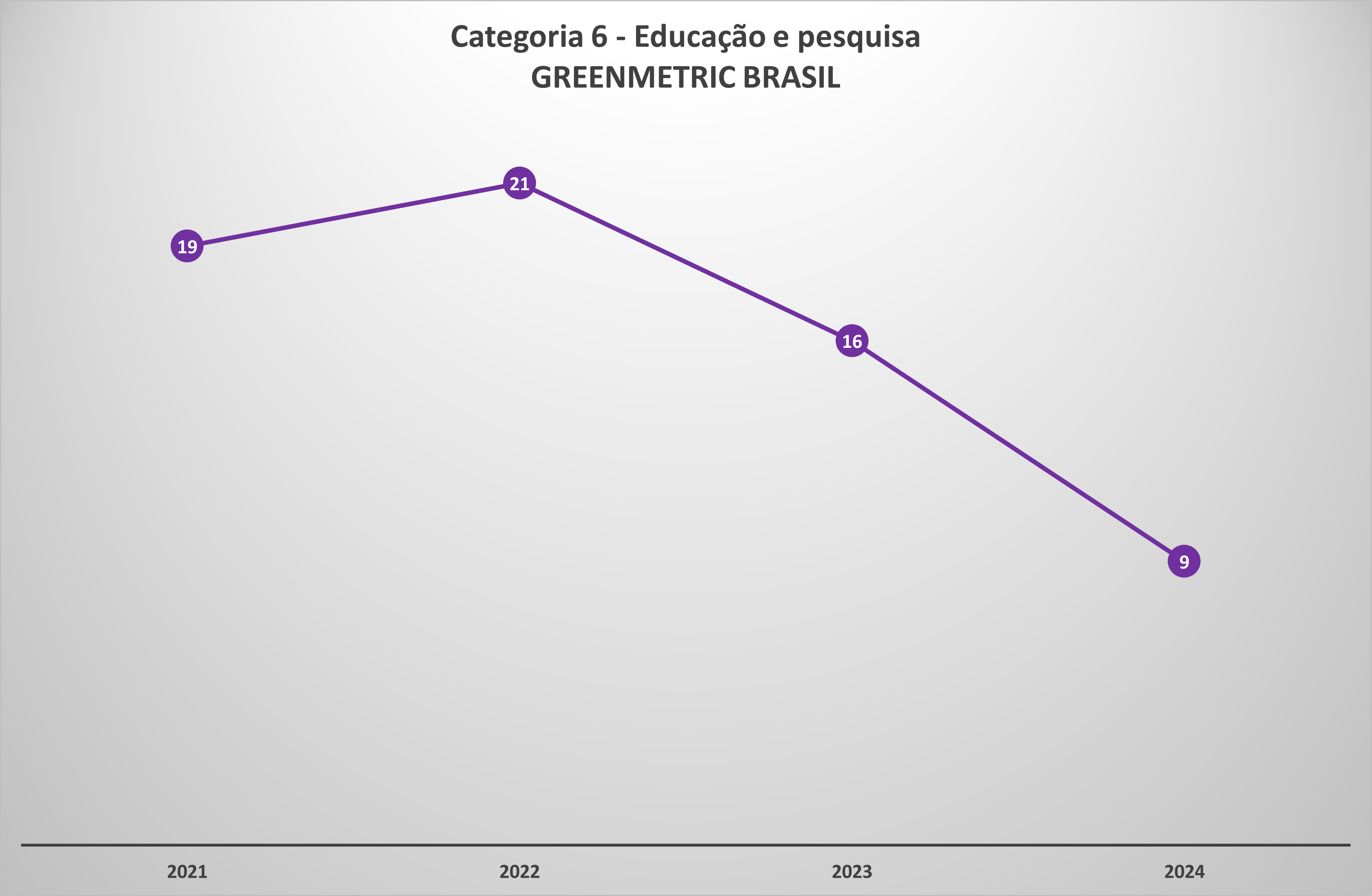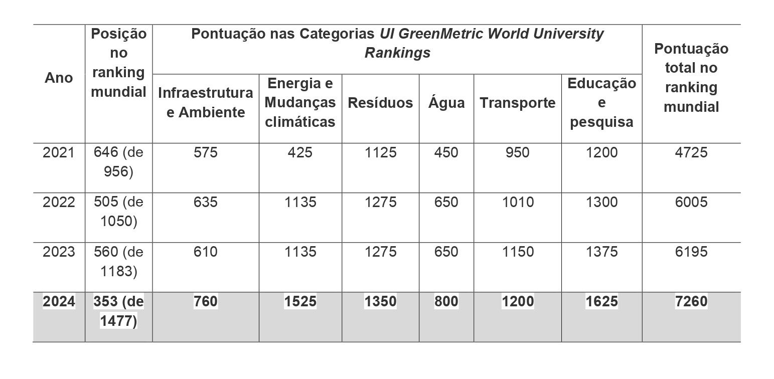 No dia 12 de dezembro de 2024 foi publicado o resultado do “2024 UI GreenMetric World University Rankings” < https://greenmetric.ui.ac.id/ >, que é uma espécie de ranking de sustentabilidade entre instituições de ensino superior (IES) no mundo e apresenta os índices mundiais de sustentabilidade, que mensuram o empenho da instituição no desenvolvimento de ações e práticas voltadas à sustentabilidade.