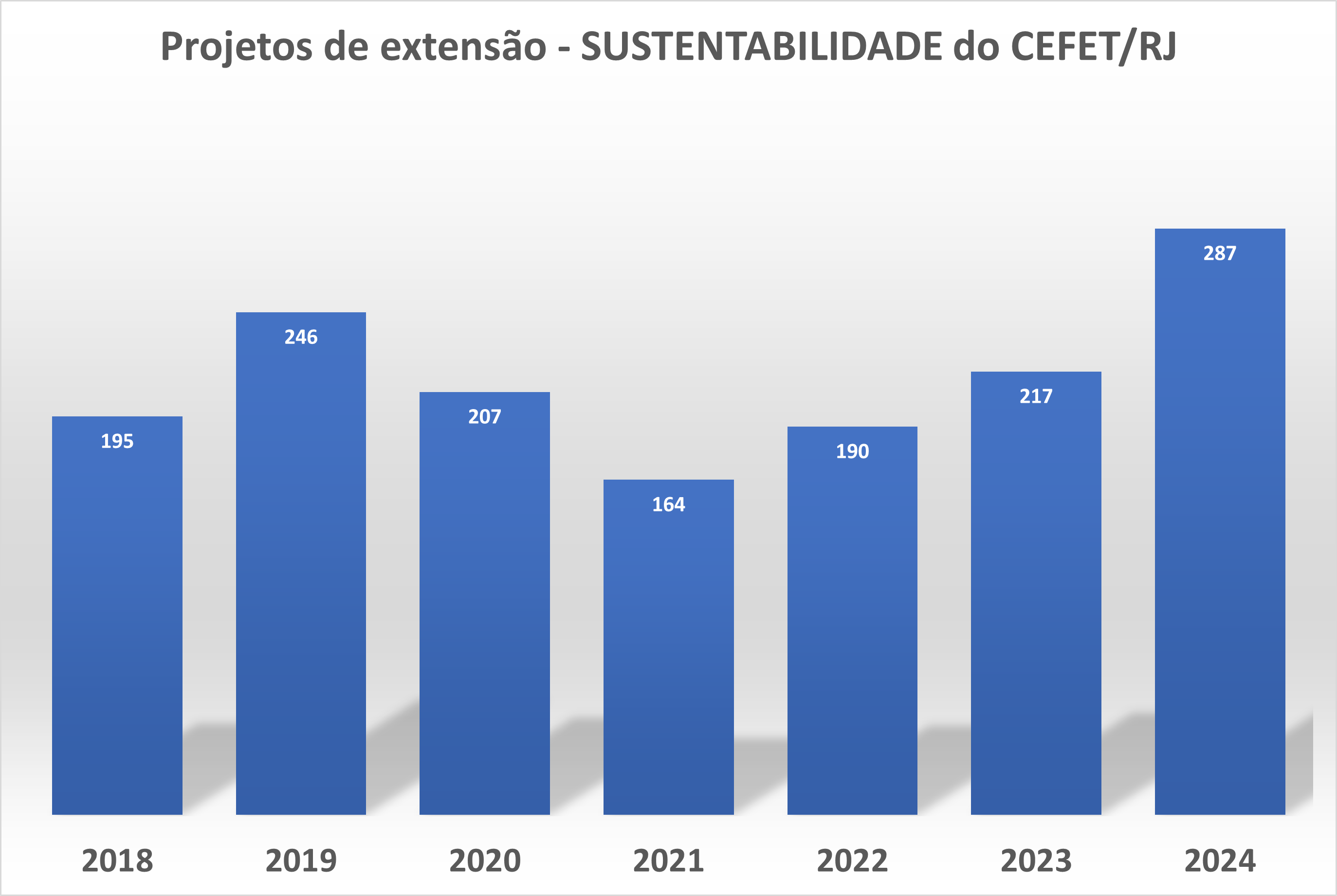 No gráfico 2,  a seguir, observa-se o desenvolvimento de projetos de extensão, relacionados à área da SUSTENTABILIDADE, que inclui os seguintes eixos temáticos (Educação, Tecnologia e Produção, Direitos Humanos e Justiça, Saúde e Trabalho) - relacionados aos 17 OBJETIVOS DE DESENVOLVIMENTO SUSTENTÁVEL - pelo Departamento de Extensão e Assuntos Comunitários (DEAC/ DIREX/ CEFET/RJ), no período de 2018 a 2024.