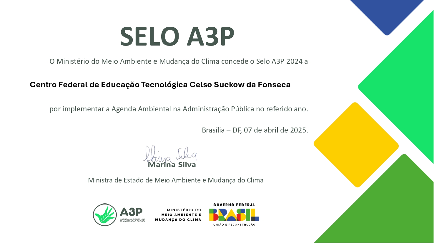 Cabe destacar que o Cefet/RJ, desde janeiro de 2018, faz parte das instituições que aderiram formalmente à Agenda Ambiental na Administração Pública (A3P). E, desde então, já recebeu 6 SELOS: em 2020, por conta do preenchimento dos dados na plataforma MMA Ressoa de 2019; em 2021, por conta do preenchimento na plataforma MMA Ressoa dos dados de 2020; em 2022, por conta do preenchimento na plataforma MMA Ressoa dos dados de 2021; em 2023, por conta do preenchimento na plataforma MMA Ressoa dos dados de 2022; em 2024, por conta do preenchimento na plataforma MMA Ressoa dos dados de 2023 e em 2025, por conta do preenchimento na plataforma MMA Ressoa dos dados de 2024..