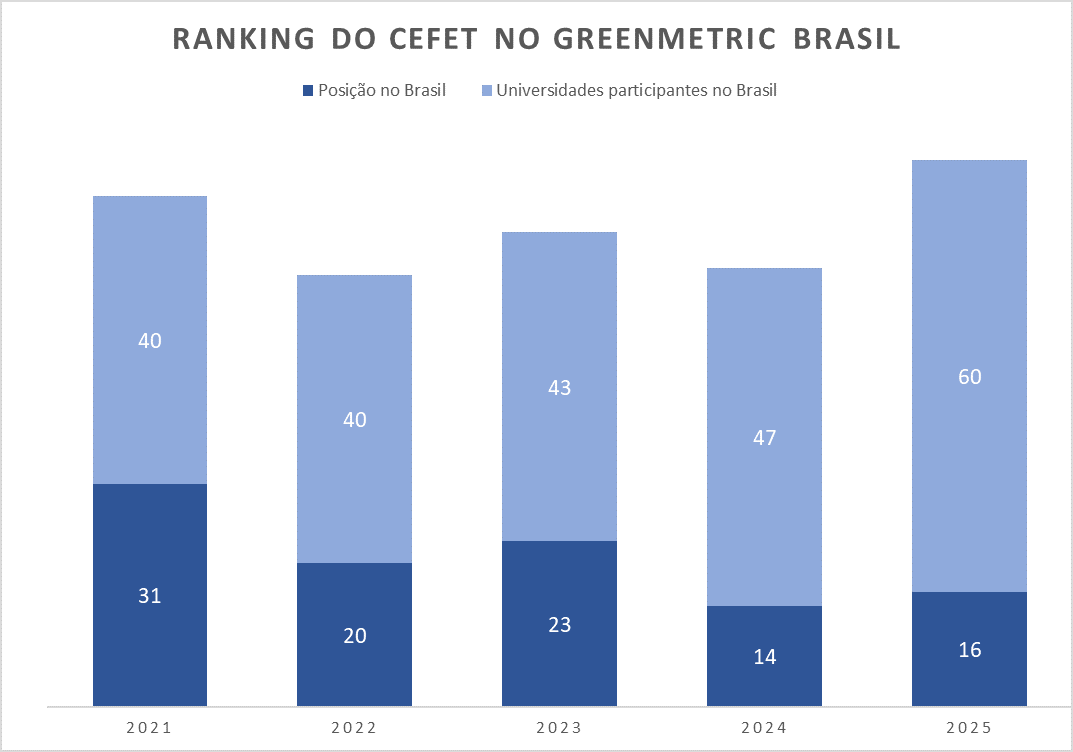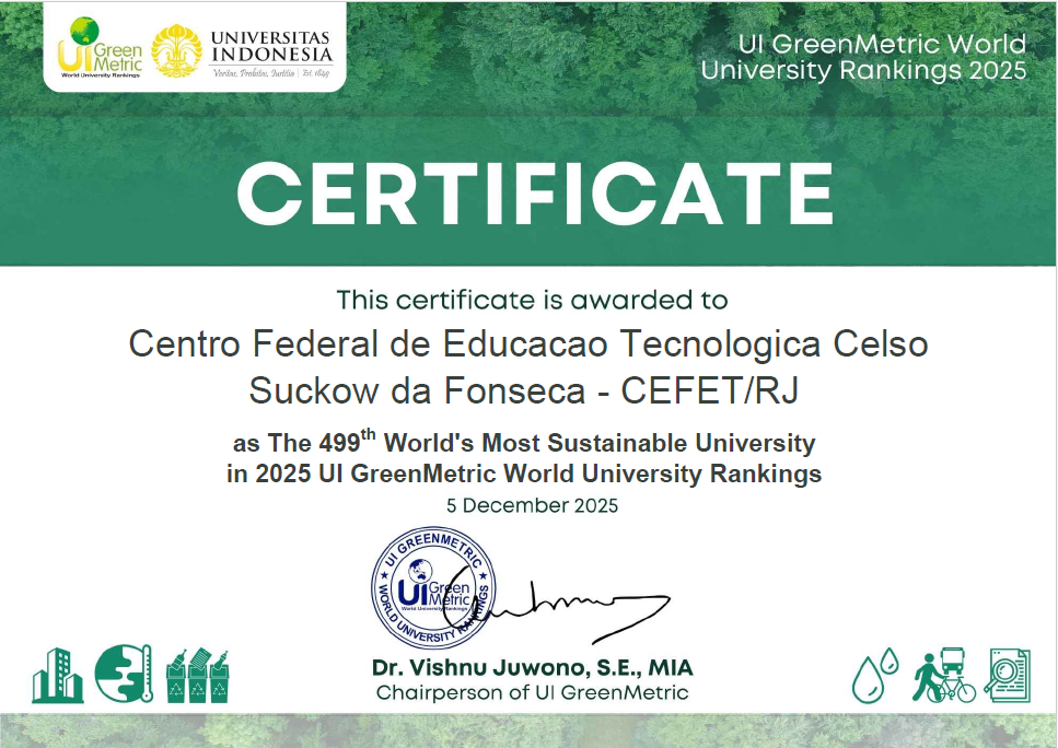 No cenário global, o Cefet/RJ solidifica sua posição de Instituição Sustentável. No dia 05 de dezembro de 2025, em sua quinta participação no UI GreenMetric World University Ranking - https://uigreenmetric.com/ -, a instituição ficou em 499º lugar em um universo de 1745 universidades de 105 países participantes. Em território nacional, dentre as 60 universidades participantes, o Cefet/RJ ficou em 16º lugar.